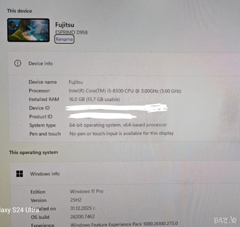 Продавам мощен настолен компютър Fujitsu Esprimo D958/E85+ – идеален за работа, учене, офис задачи и ежедневна употреба.