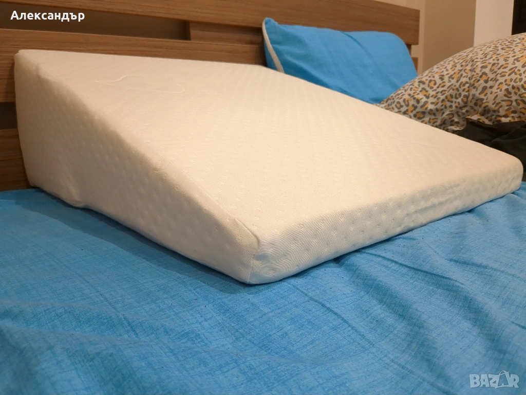 Чисто нова антирефлуксна / клиновидна възглавница Softlife за възрастни с размери - Височина (в най-високата част) 23.5 см. Височина (в най-ниската част - 3см.) Дължина - 63см., Ширина - 58см. Възглавницата е като нова ползвана е 1-2 пъти. Цената в магазин е над 70 евро.