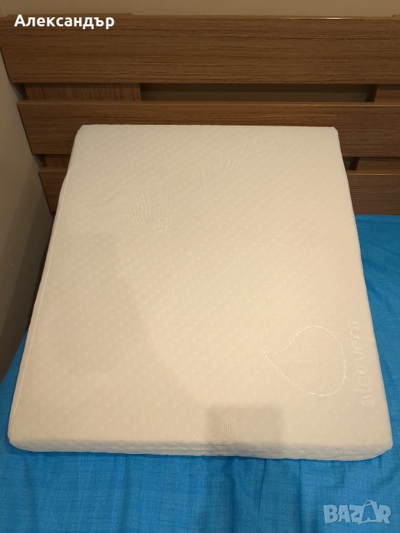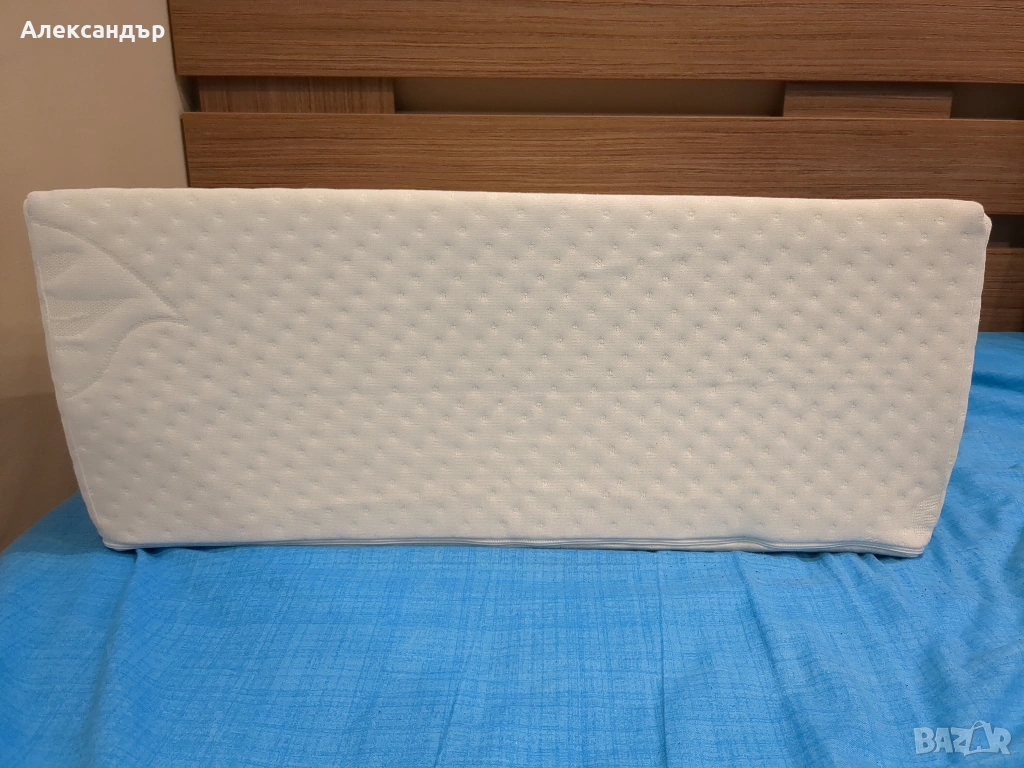 Възглавница - 100% виско-еластична пяна (Memory Foam). Мемори пяната представлява вискозо-еластична полиуретанова материя с клетъчна структура, приспособяваща се към формата на тялото.