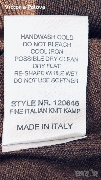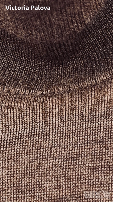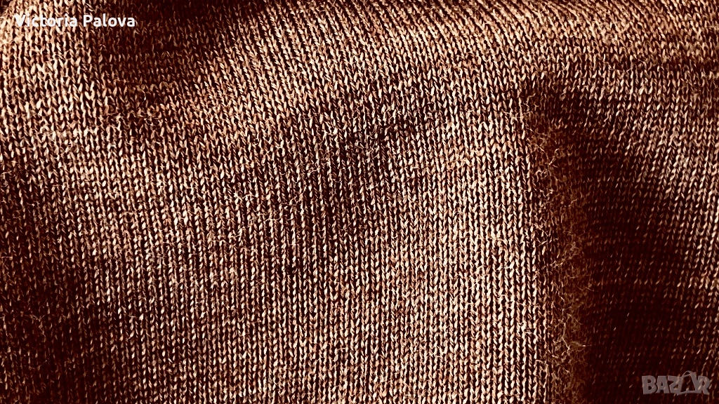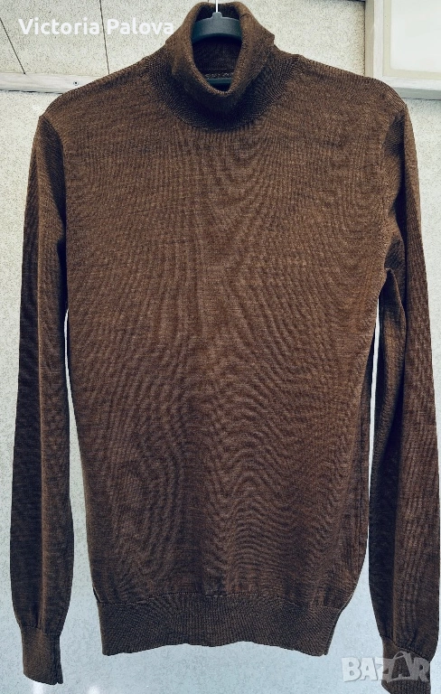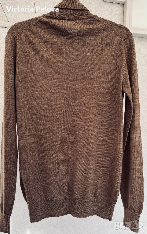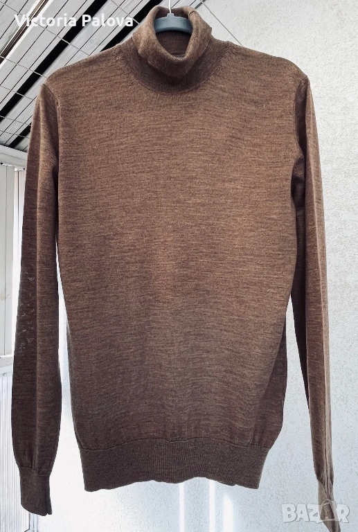 Елегантен, особено красив пуловер от премиум датска марка, известна с изключително скъпи висококачествени колекции, които комбинират минимализъм с лукс. Пуловерът е тънък и лек, с усещане на допир като фина коприна, произведен е в Италия за безкомпромисно качество и комфорт. Красивият му нюанс на топъл кафяв се допълва от висока яка, дълги ръкави с елегантни маншети и плътна деликатна плетка, която подчертава изчистения силует. В перфектно състояние, с едва доловим шев отзад на гърба, който не се забелязва. Рамо - 46см, ГО - 53см, дължина - 73см, ръкав - 71см.