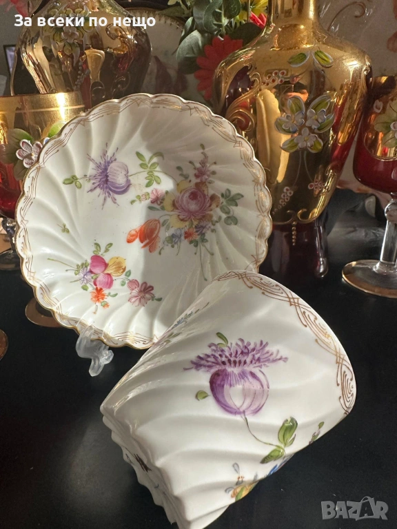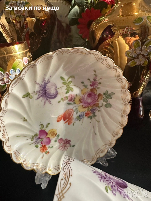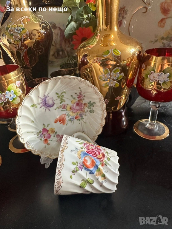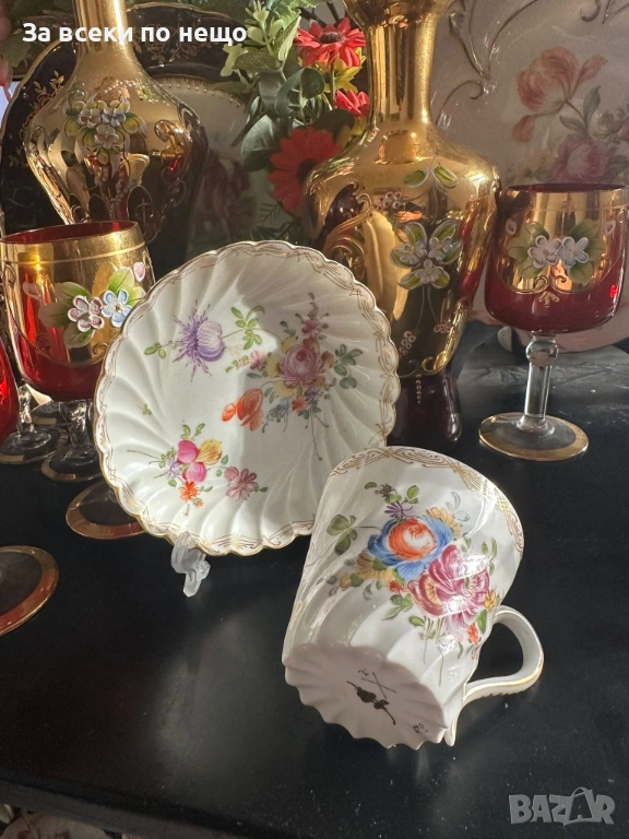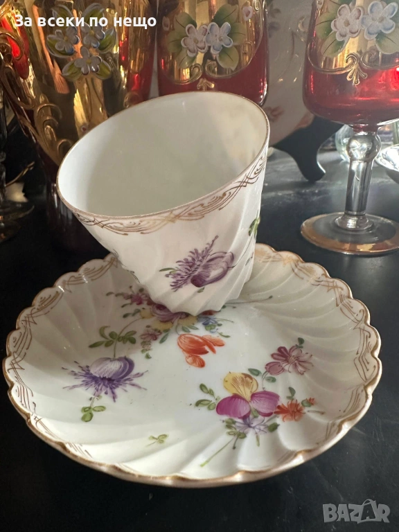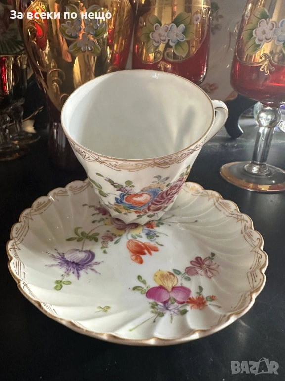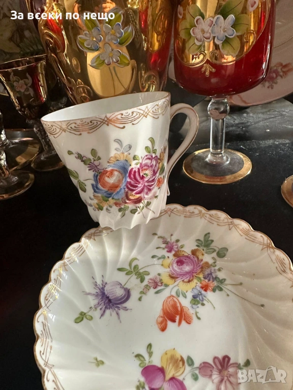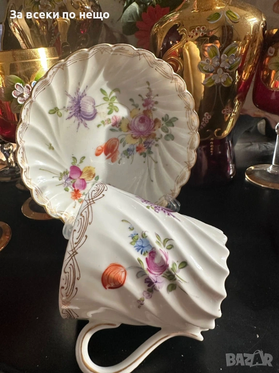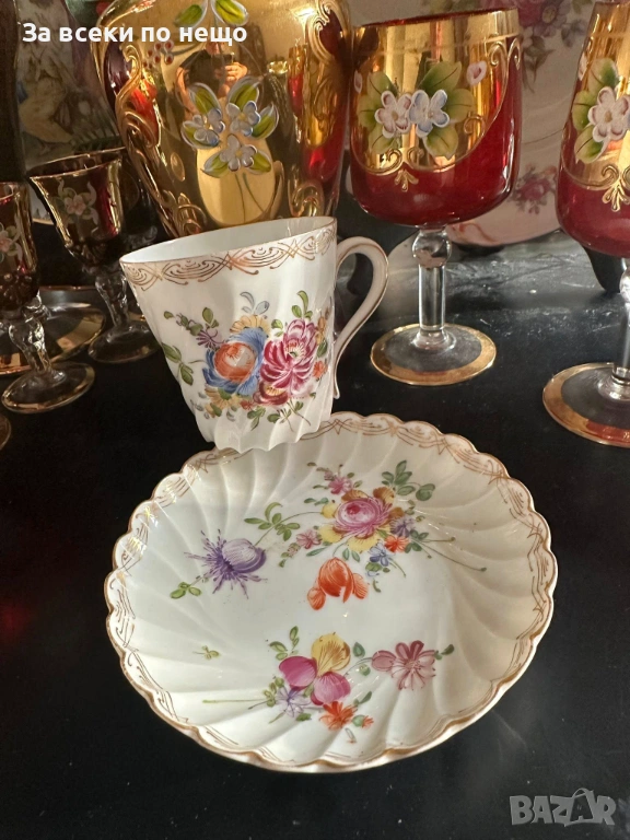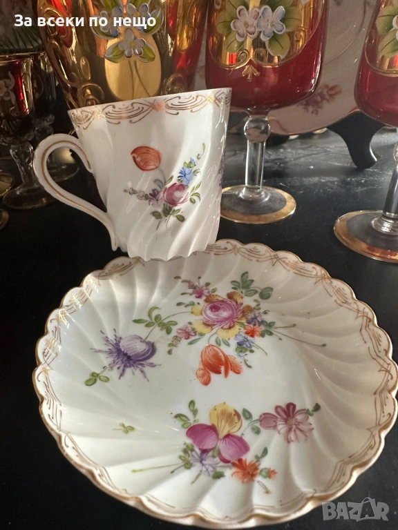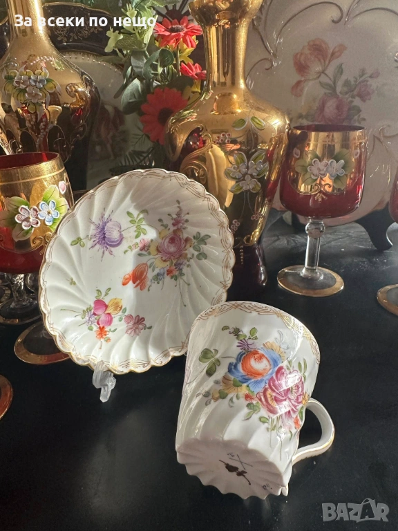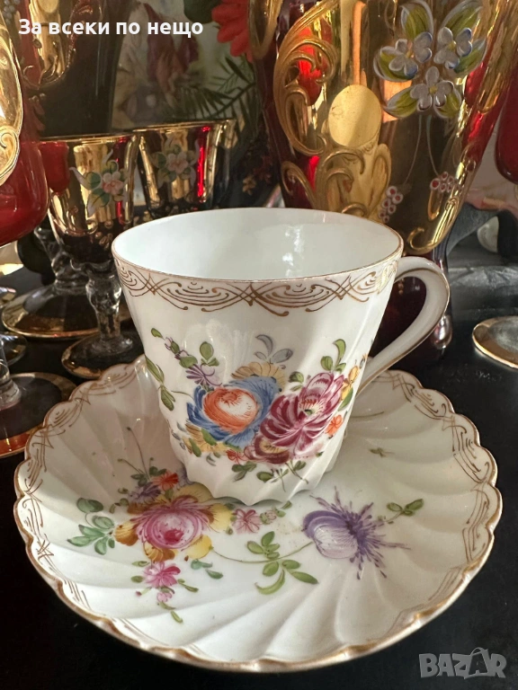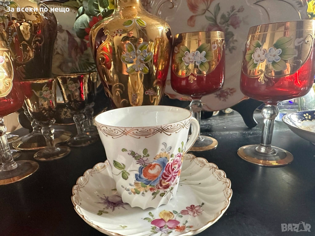 Dresden Germany Circa 1901 The Carl Thieme porcelain company was founded in 1886(or 1836) in Potschappel, Saxony, Germany, by Carl Thieme - невероятно красив двоен сета, с ръчно нарисувани букети и цветя, феерия от багри и класа, великолепие от историята с вместимост от 175 мл,отлично качество и състояние, безценна немска презантация на арт класика.