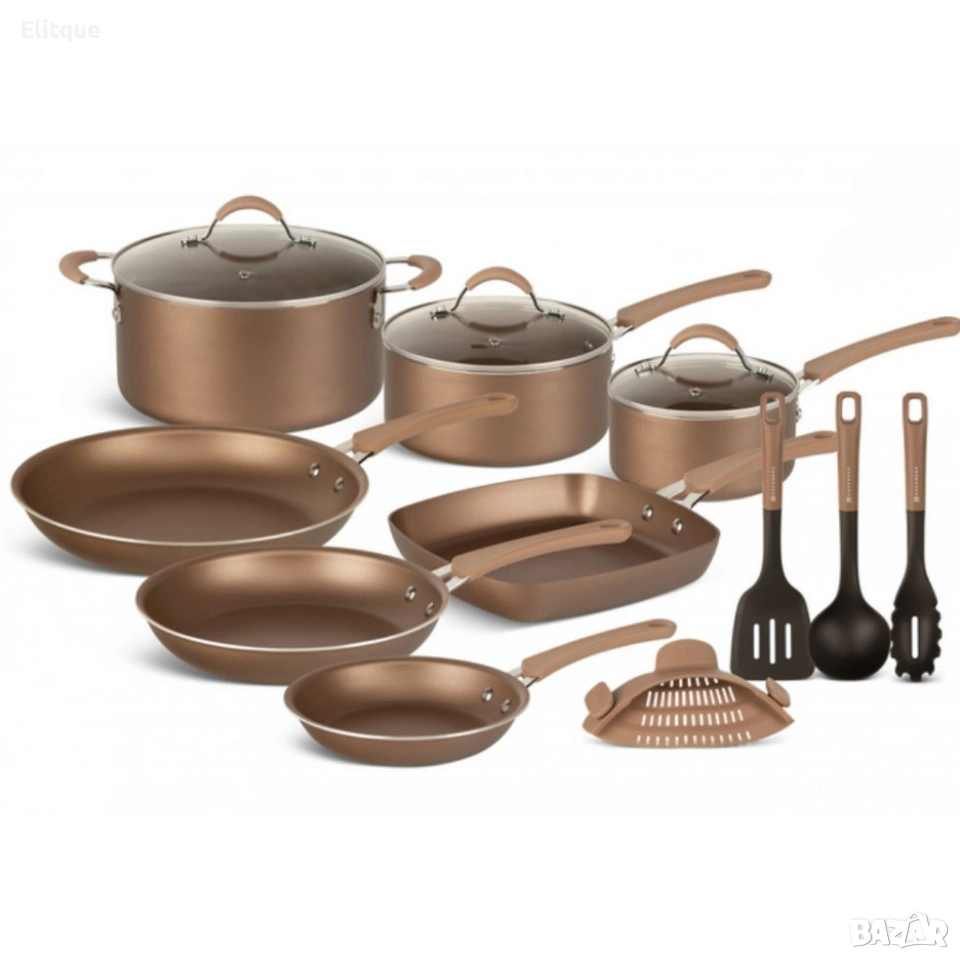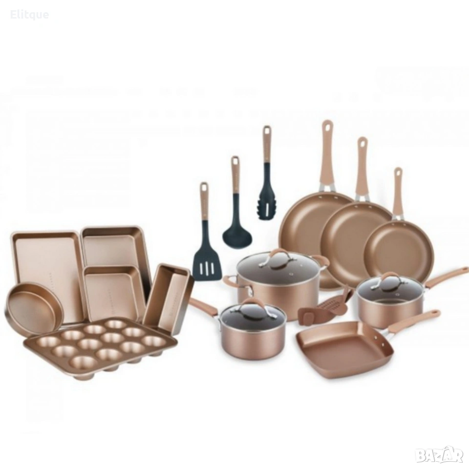 Материал: кован алуминий Покритие: мраморно, незалепващо, без PFOA Дръжки: силиконови, меки на допир, устойчиви на нагряване Капаци: закалено стъкло с отвор за пара Съвместимост: всички видове котлони, включително индукция Размери и съдове в комплекта: Тенджера 16 x 8 см с капак — 1,6 л Тенджера 20 x 9 см с капак — 2,8 л Тенджера 24 x 12 см с капак — 5,4 л Тиган 20 x 4 см Тиган 26 x 4,8 см Тиган 30 x 5 см Квадратен тиган 24 x 24 x 4,3 см 3 бр. найлонови кухненски инструменти 6 бр. тави: Тава за мъфини 15,35 x 11,02 x 1,57 см Форма за кекс 9,09 x 5,04 x 2,72 см Кръгла тава 8,54 x 1,97 см Тава 13,38 x 9,64 x 2,16 см Тава 13,38 x 9,64 x 1,38 см Цедка