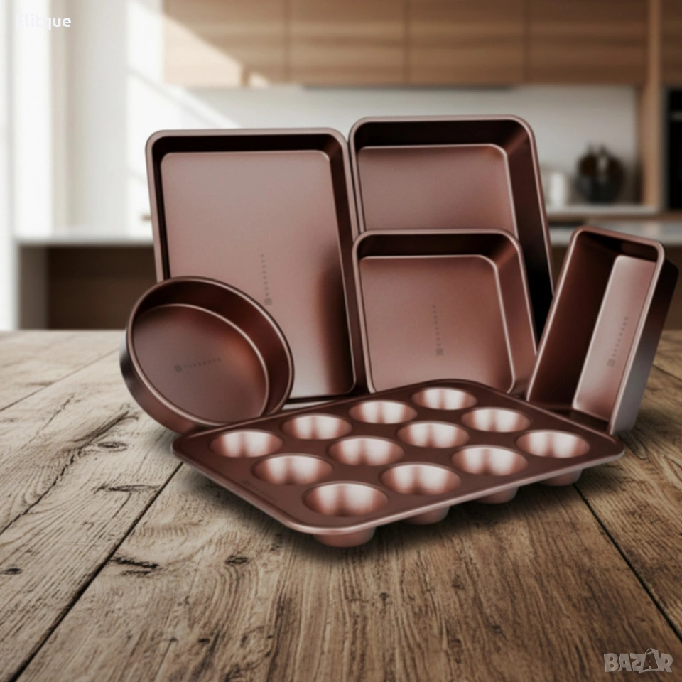 Материал: кован алуминий Покритие: мраморно незалепващо покритие, без PFOA, 3-слойно Съвместимост: подходящ за всички видове печки, включително индукция Дръжки: меки на допир силиконови, термоизолирани Капаци: закалено стъкло с отвор за пара Устойчивост: на надраскване и високи температури Размери на съдовете в комплекта: Тенджера 16 x 8 см с капак — 1,6 л Тенджера 20 x 9 см с капак — 2,8 л Тенджера 24 x 12 см с капак — 5,4 л Тиган 20 x 4 см Тиган 26 x 4,8 см Тиган 30 x 5 см Квадратен тиган 24 x 24 x 4,3 см Тава за мъфини 15,35 x 11,02 x 1,57 см Форма за кекс 9,09 x 5,04 x 2,72 см Кръгла тава 8,54 x 1,97 см Тава 13,38 x 9,64 x 2,16 см Тава 13,38 x 9,64 x 1,38 см Цедка