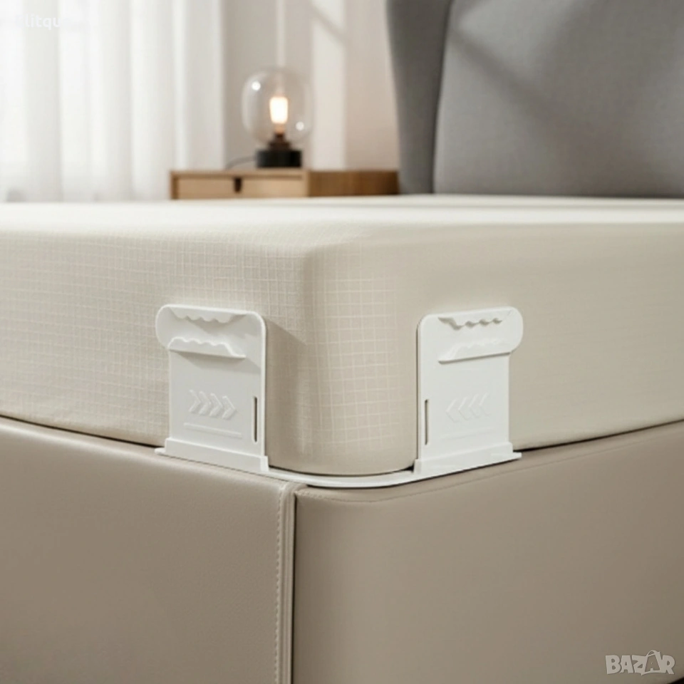 Продукт: Държачи за чаршафи, които не се плъзгат; Брой в комплект: 4 броя; Материал: Найлонови ленти и PP елементи; Цвят: Бял с прозрачни ленти; Съвместимост: всички видове и размери чаршафи; Подходящи за: единични, двойни, ъглови и ластични чаршафи; Инсталация: еднократна, без инструменти; Предназначение: фиксиране на чаршафи под матрака.