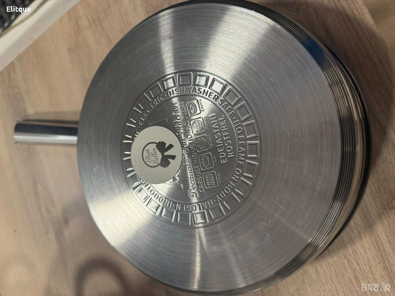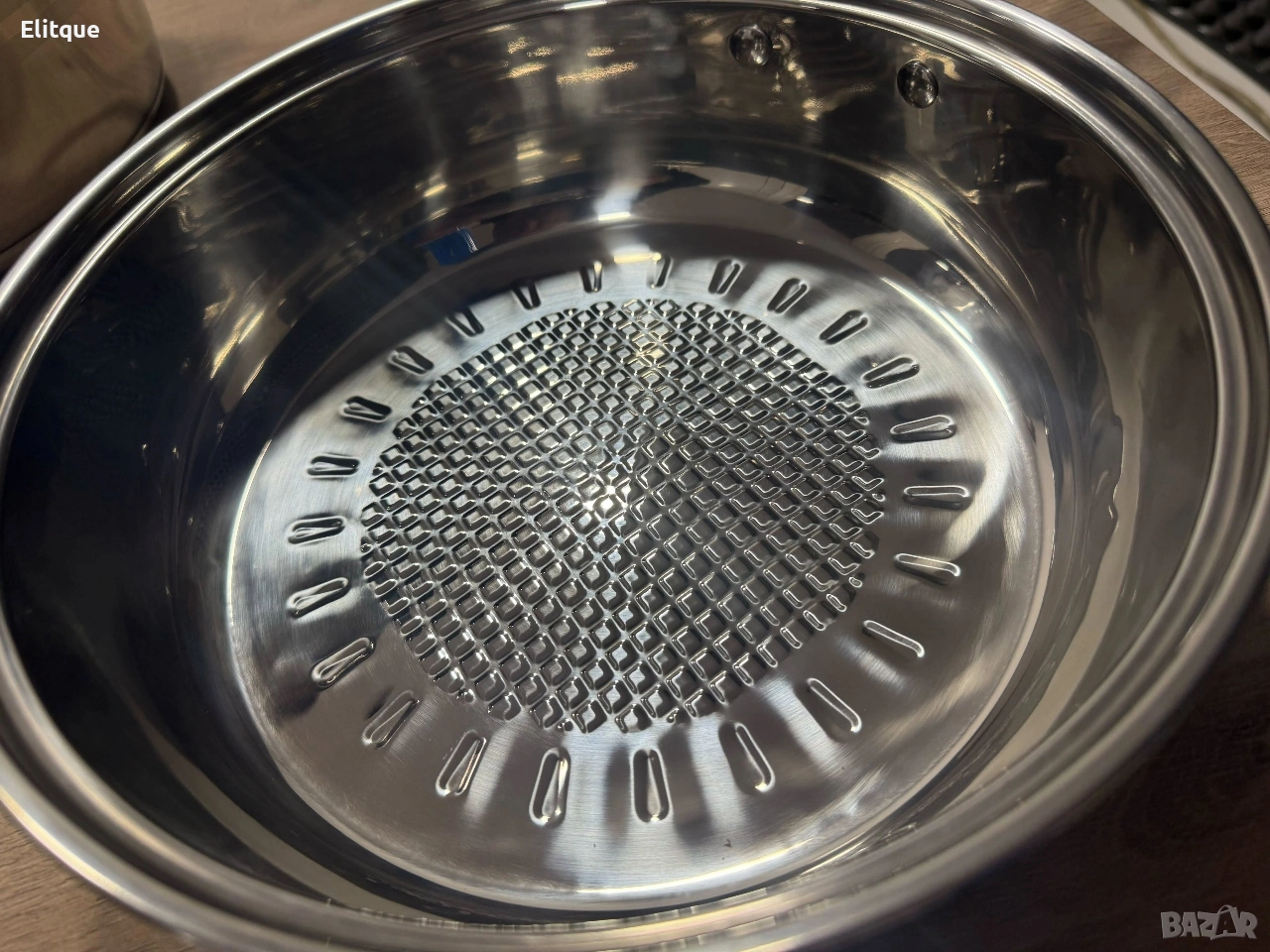 Комплект тенджери – 12 части Основен проблем, който решава: неравномерно готвене, загаряне, бърза загуба на топлина Решение: 5-слойно дъно + неръждаема стомана за равномерно, контролирано и енергийно ефективно готвене Материал: корозионно устойчива неръждаема стомана Дъно: 5-слойно термодъно Съвместимост с котлони: индукция, газ, електрически, керамични Размери и вместимост: Тенджера с капак Ø 16 × 10.5 см – 2.1 L Тенджера с капак Ø 18 × 11.5 см – 2.9 L Тенджера с капак Ø 20 × 12.5 см – 3.9 L Тенджера с капак Ø 24 × 14.5 см – 6.6 L Касерола с капак Ø 16 × 10.5 см – 2.1 L Тиган с капак Ø 24 × 7.5 см – 3.4 L Почистване: подходящи за миялна машина Безопасност: термоизолирани дръжки; капаци от закалено стъкло Сертификация: CE