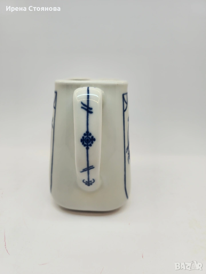 Кана за мляко с декор сламено цвете, "Indisch Blau" Walter. Кана за мляко с декор сламено цвете, "Indisch Blau" Walter. Вместимост 850 мл, височина 13 см, 17/7 см. В отлично състояние. Опаковам лично и старателно, изпращам с Еконт.