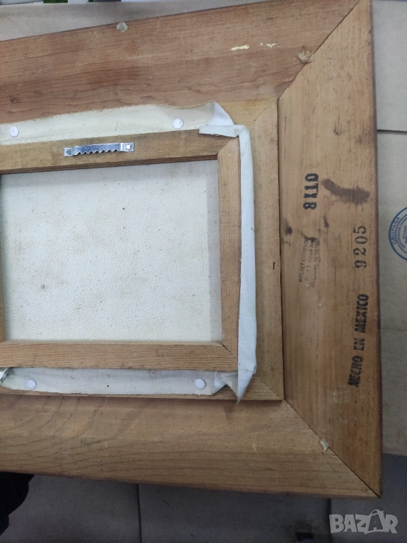 Рамката е дървена, двойна, с вътрешен златист и външен бледорозов кант. Произведена от Wolsey Company, американска компания в Мексико.