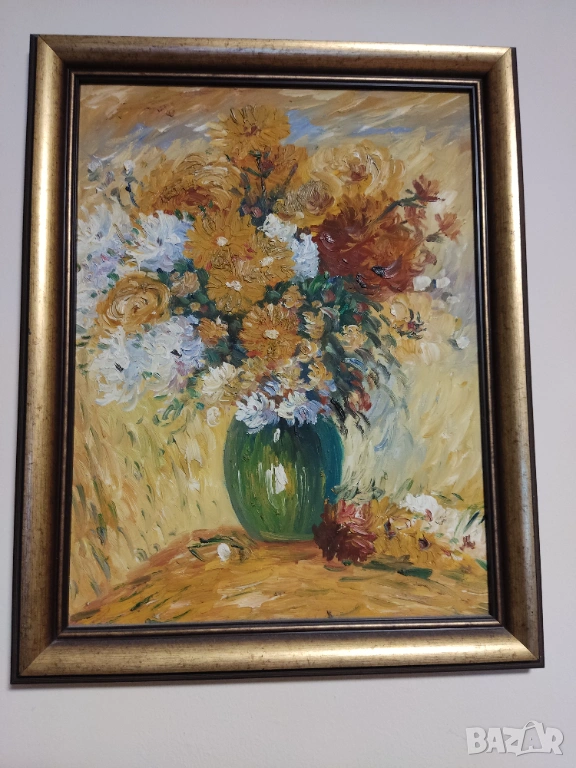 3. Маслена репродукция в/у платно на „Букет от хризантеми“ на Реноар. От Х. Павлов. Дървена рамка.
