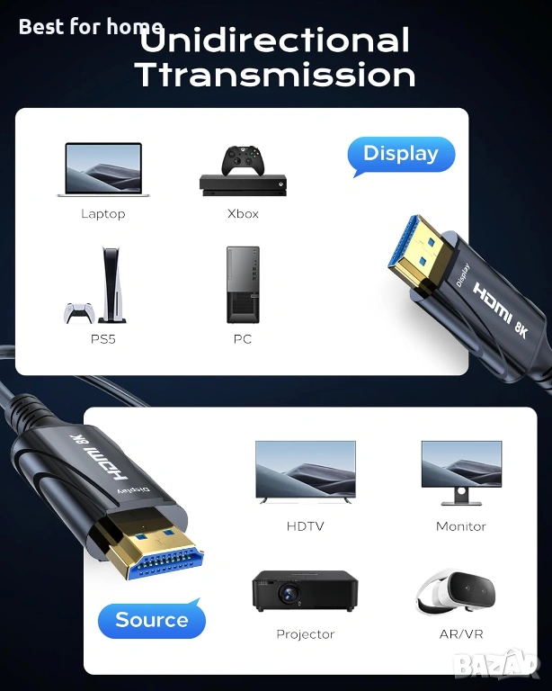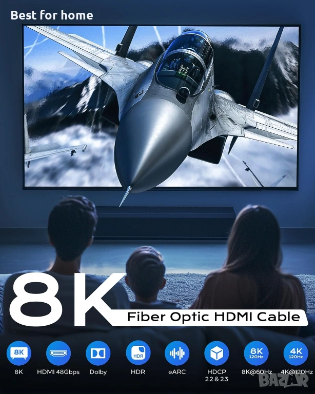 Оптичен HDMI кабел с дължина 65 фута/20 метра - 8K 48Gbps високоскоростен HDMI кабел/8K 60Hz/4K 120Hz, HDCP 2.2 и 2.3, HDR10 - съвместим с HDTV/монитор/проектор.