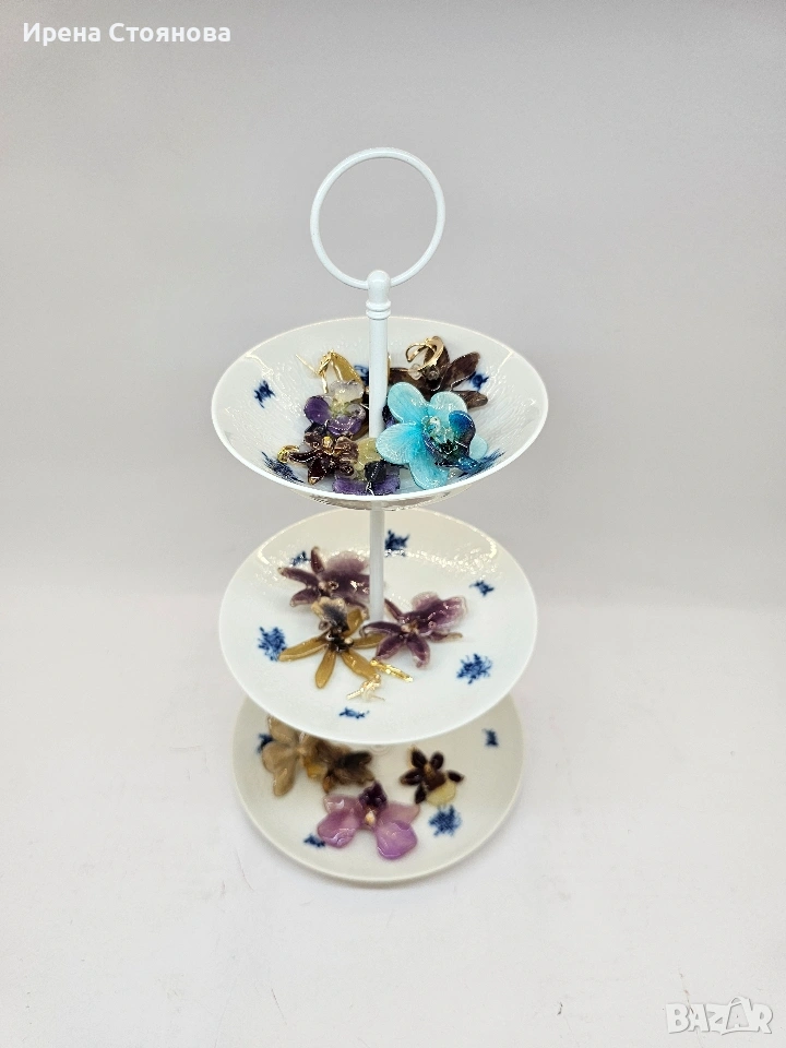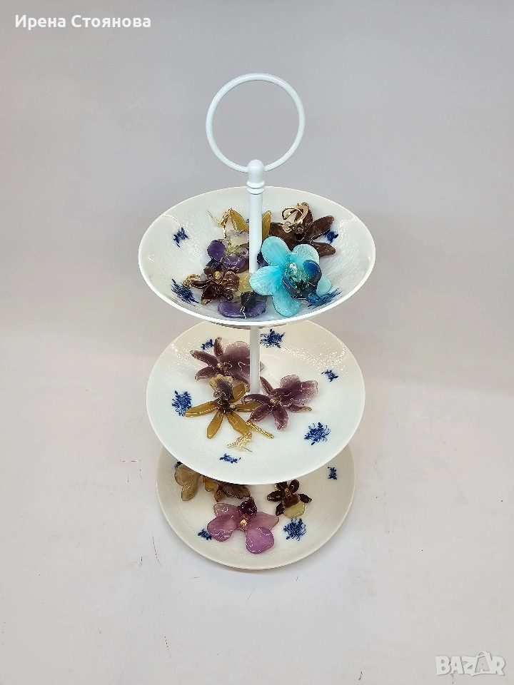 Мини поднос на теи нива, за сервиране на ядки, сладки или каквото ви хрумне( може и за декоративни цели). Отдолу - нагоре чиния 17 см, 15,5 см, купичка 12,7 см и височина 3,4 см.