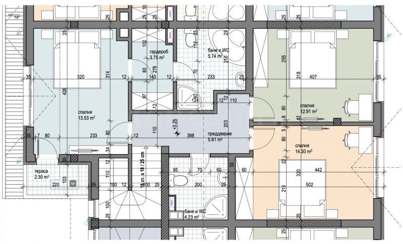 гараж, веранда, 3бр. спални, гардероб, 2бр. баня с тоалетна и тераса.