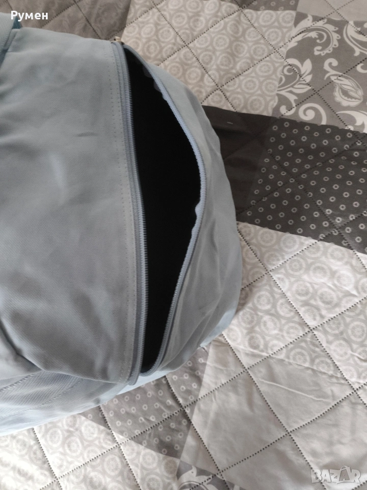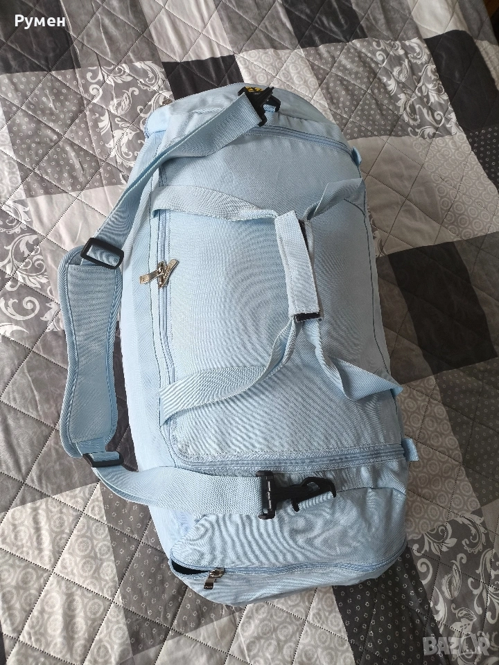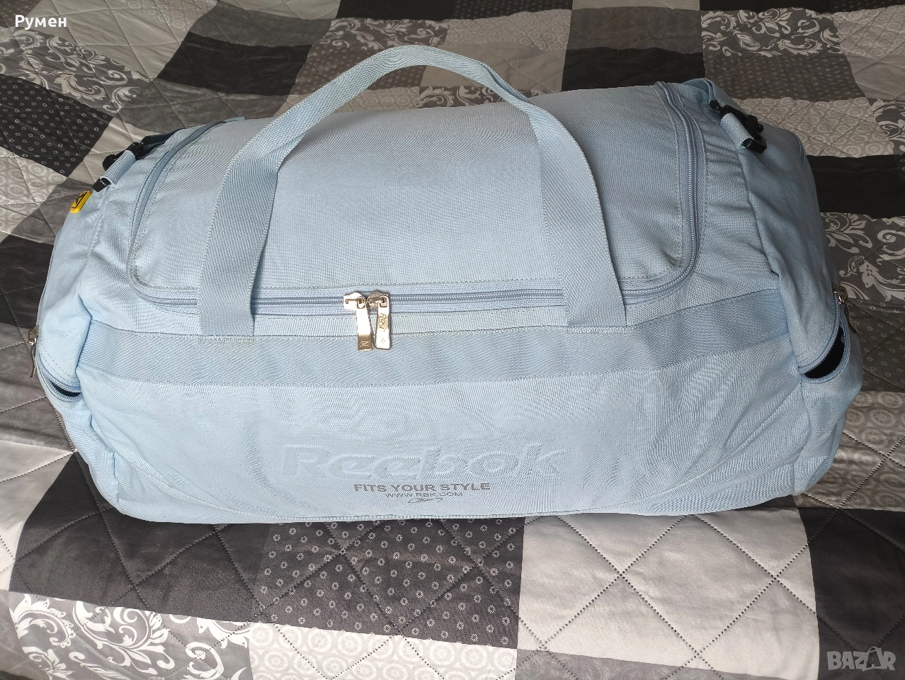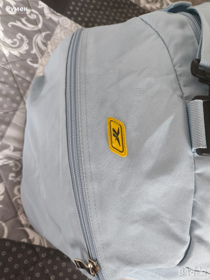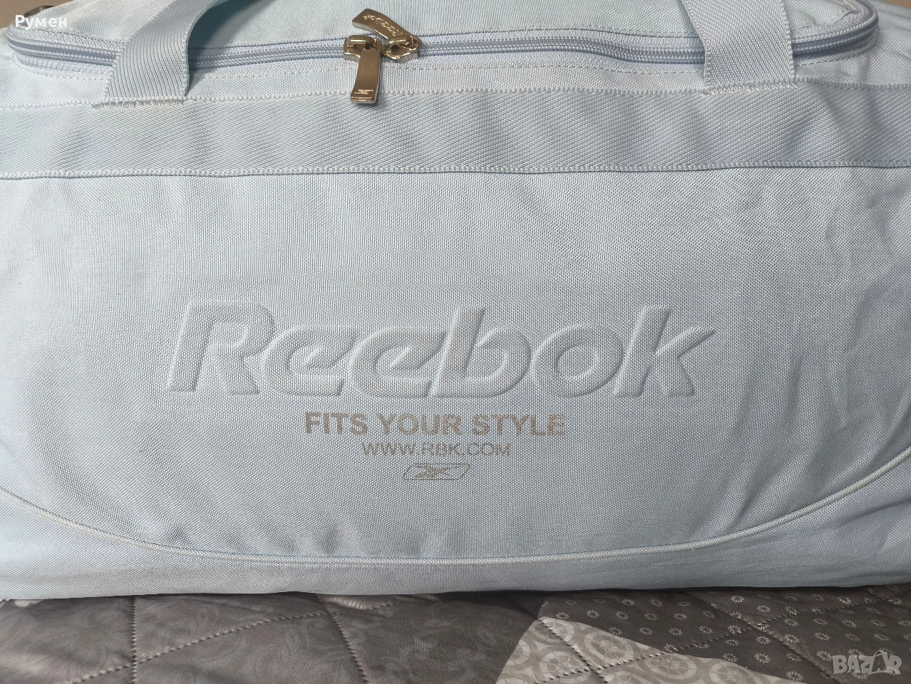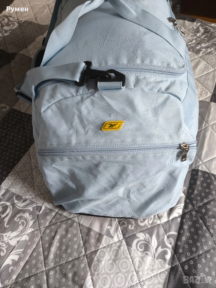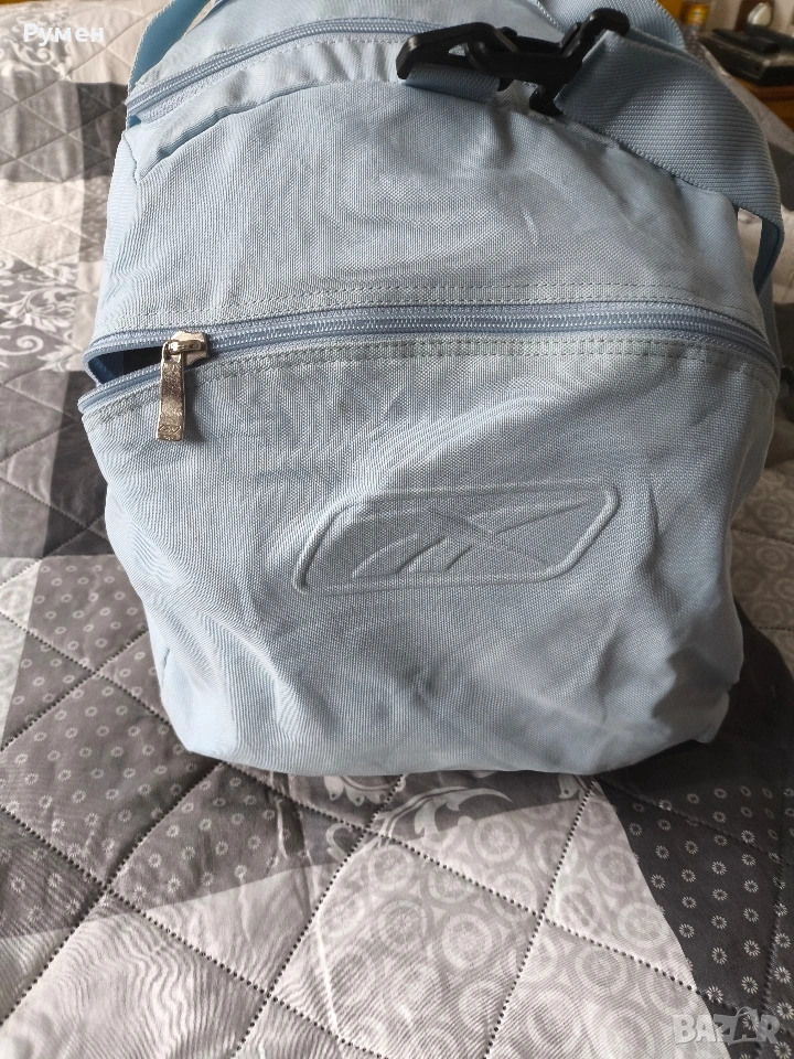 Оригинален спортен сак Reebok светло син с размери дължина 650 мм./ширина 300 мм./височина 300 мм. с промазка от вътре на плата , на едно место е одлепена малко.