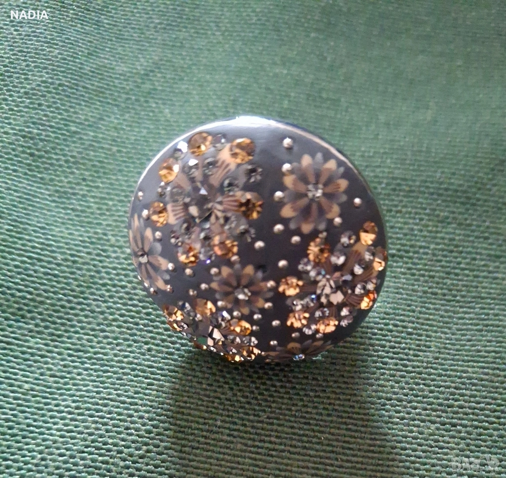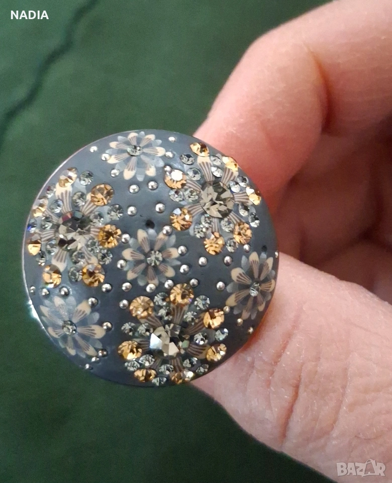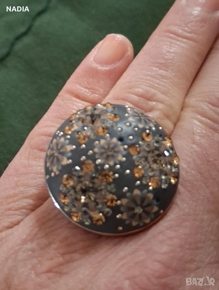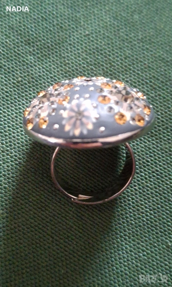 Пръстен с кръгла корона 3,5см обсипана с камъчета които блестят дискретно.Големината се регулира.
