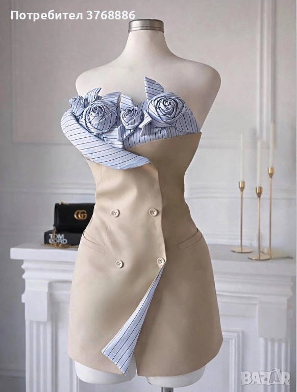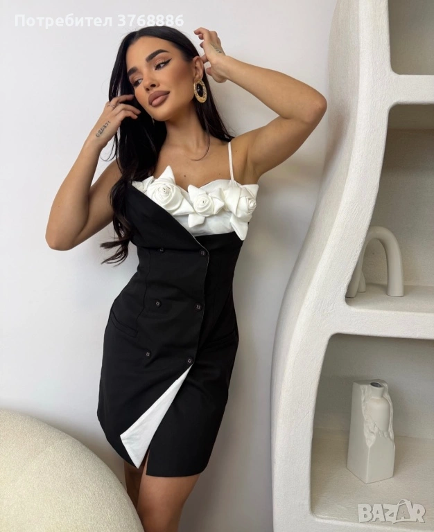 Къса рокля по тялото с твърда чашка, скрит цип отзад, регулиращи презрамки. Има декоративни копчета отпред и ефектни рози на деколтето.