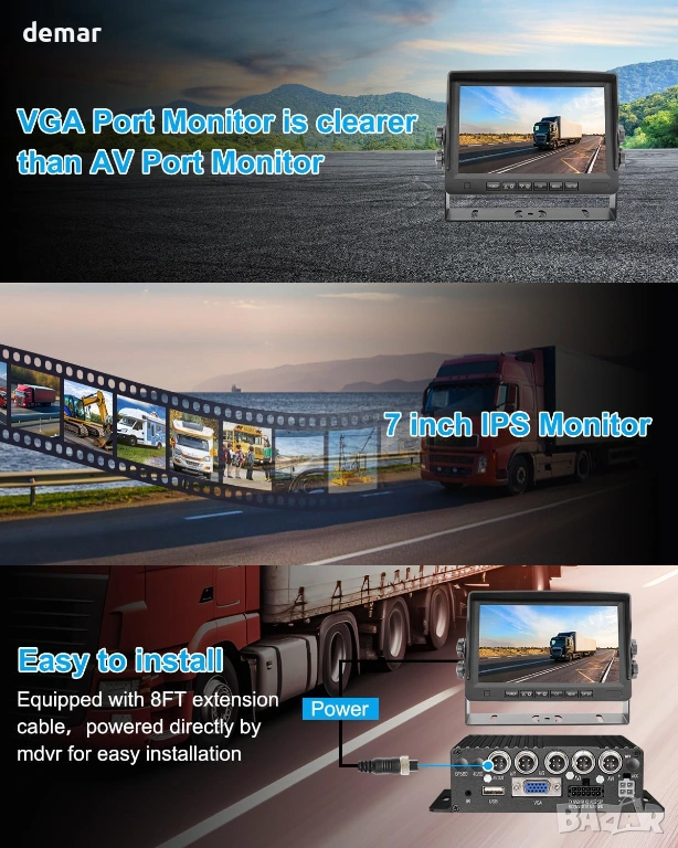 Тази система от камери за превозни средства разполага с компактен MDVR с непрекъснат запис, поддържащ две 512 GB SD карти (SD картите не са включени) до 1 TB и ефективно H.265 компресиране за максимално съхранение, като същевременно автоматично презаписва стари кадри. Тя включва четири издръжливи 1080p метални камери с инфрачервено нощно виждане и водоустойчив корпус за надеждна употреба на открито, плюс вътрешна куполна камера със запис на звук за наблюдение в кабината. 7-инчов HD монитор осигурява ясен многокамерен изглед за намаляване на слепите зони и може лесно да се захранва от MDVR. Изградена със суперкондензатор за стабилност при вибрации, системата поддържа заключване при събития, наблюдение на паркирането до 24 часа, помощ при резервна мрежа, превключване на дисплея, задействано от аларма, и дискретен IR удължител за скрит и спретнат монтаж.