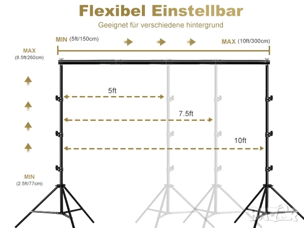 * Регулируема ширина: Мин. 150 см – Макс. 300 см (10 ft)