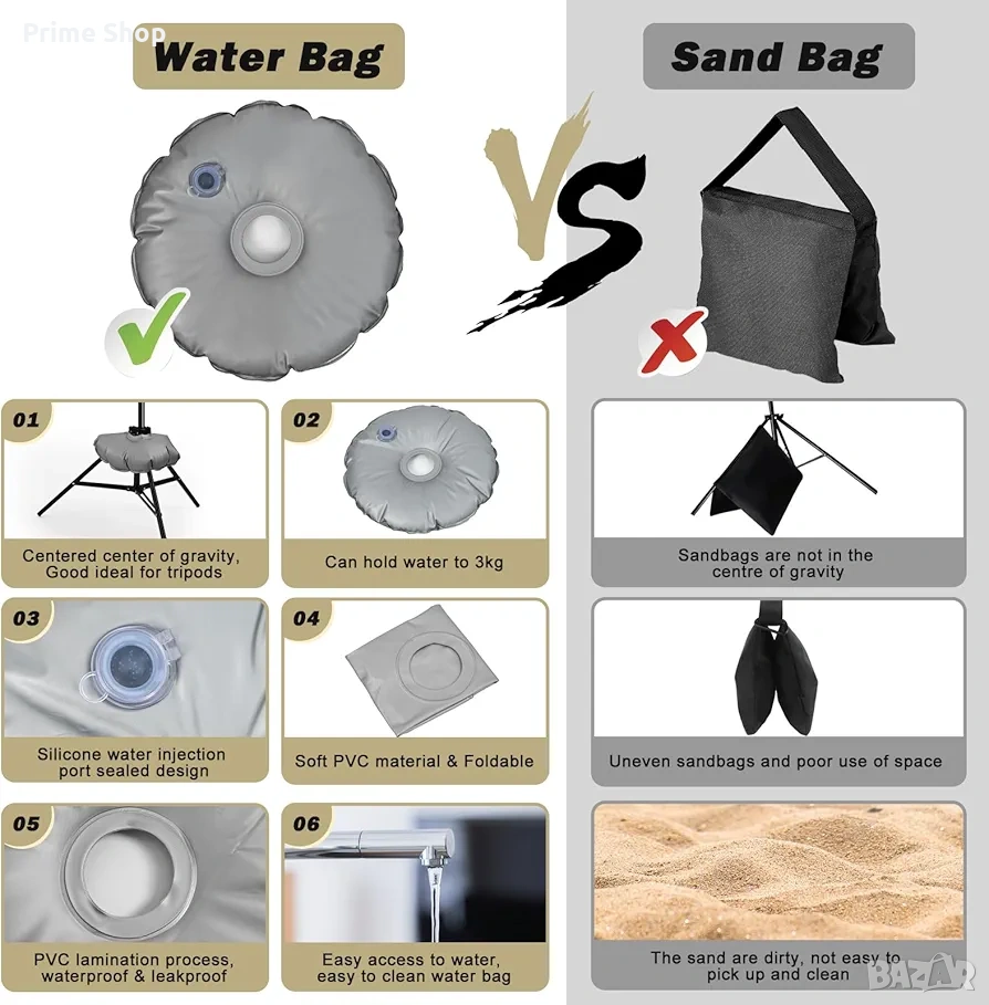 * Подобрена стабилност на основата: Триподите разполагат с по-широк размах на краката за по-добра опора. В комплекта са включени специализирани водни торби (с капацитет до 3 кг), които се поставят в центъра на тежестта на стойката, осигурявайки значително по-голяма стабилност в сравнение със стандартните пясъчни торби.