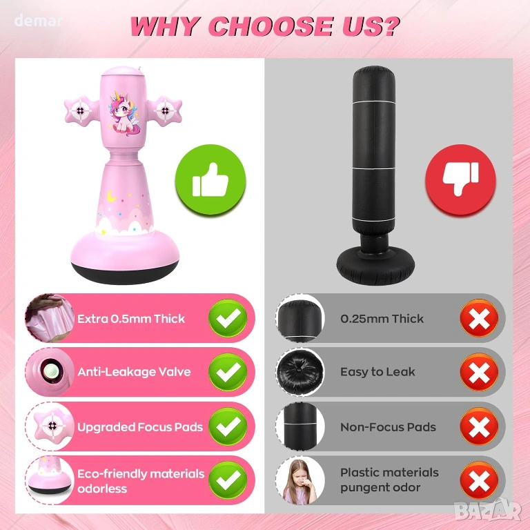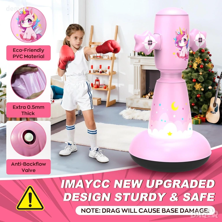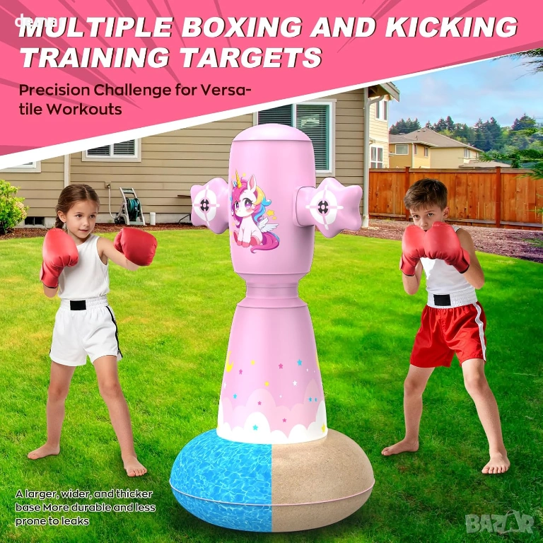 Тази надуваема детска боксова круша е с множество целеви зони за удряне с юмруци и ритане, което спомага за подобряване на координацията, фокуса и двигателните умения, като същевременно поддържа децата активни. Изработена от дебел, издръжлив PVC с широка, пълна с вода основа, тя предлага добра стабилност и бързо отскачане за енергична игра. Настройката е бърза и лесна, с лесно надуване, изправен баланс и удобно изпускане за съхранение или транспорт. Комплектът включва ръкавици, подходящи за деца, и помпа, което я прави подходяща за употреба на закрито или на открито и насърчава упражнения без екрани, облекчаване на стреса и активна игра за малки деца.