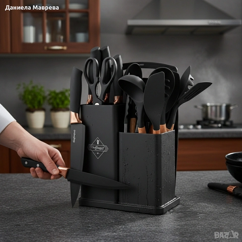 Допълнителни функции: включва стабилна поставка/контейнер за подредено съхранение и практична дъска за рязане;