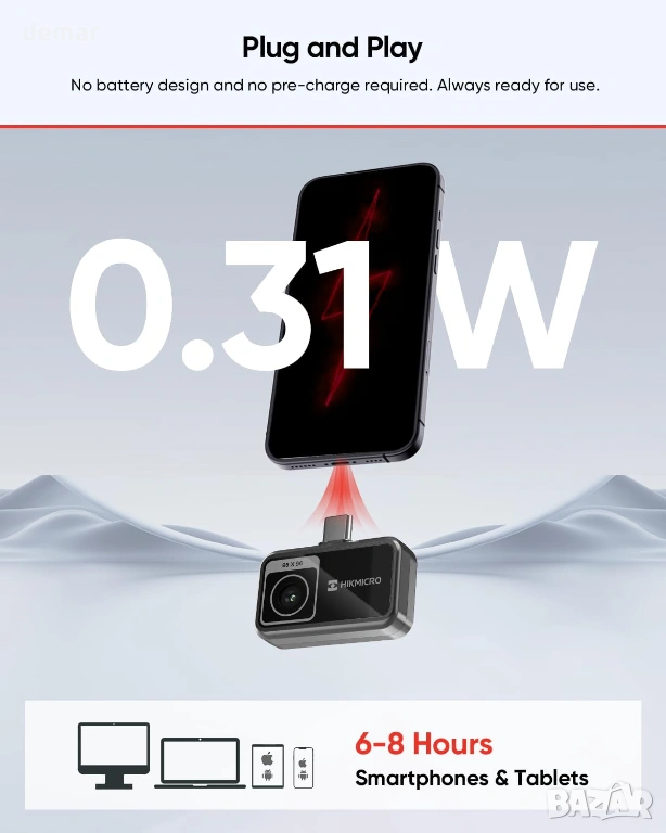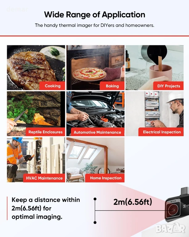 Компактен и лек, този plug-and-play термовизор осигурява подобрена яснота на изображението чрез обработка в реално време, която подобрява детайлите, намалява шума и изостря ръбовете, като същевременно осигурява плавно 25Hz изображение с регулируеми визуални настройки. Той предлага прецизно откриване на температура с висока точност в широк диапазон на измерване, подкрепено от конфигурируеми настройки на емисионната способност и разстоянието. Множество режими на измерване, персонализируеми точки и области, гъвкави цветови палитри, регулируеми температурни граници и избираеми мерни единици позволяват гъвкаво използване при битови, автомобилни и електрически инспекции. Проектиран с ултраниска консумация на енергия и без вътрешна батерия, той работи за продължителни периоди, когато е свързан със смартфон или таблет, и включва поддръжка за въртене, удължителен кабел, чанта за съхранение и USB адаптер за гъвкави и удобни за потребителя инспекции.
