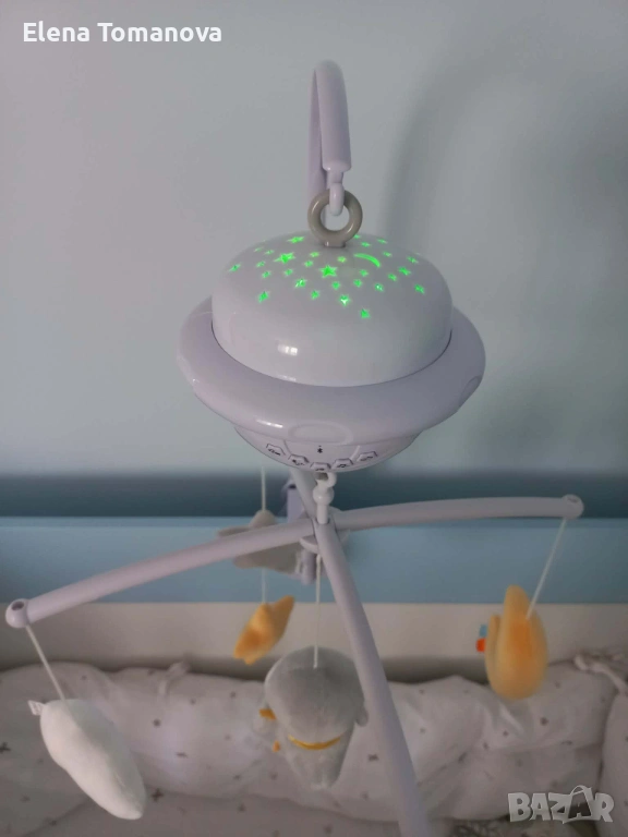 Играчката има проектор, който проектира различни форми и цветове, докато плюшените фигурки се въртят над главичката на детето и го карат да се заглежда, като по този начин развива зрението и слуха. Разполага с Bluetooth функция, която позволява свързване с устройство, което да изпълнява любими песни и звуци и с възможност за регулиране нивото на звука. Благодарение на универсалната щипка можете да поставяте въртележката на дървено легло и сгъваема кошара, а плюшените играчки могат да се свалят и перат.