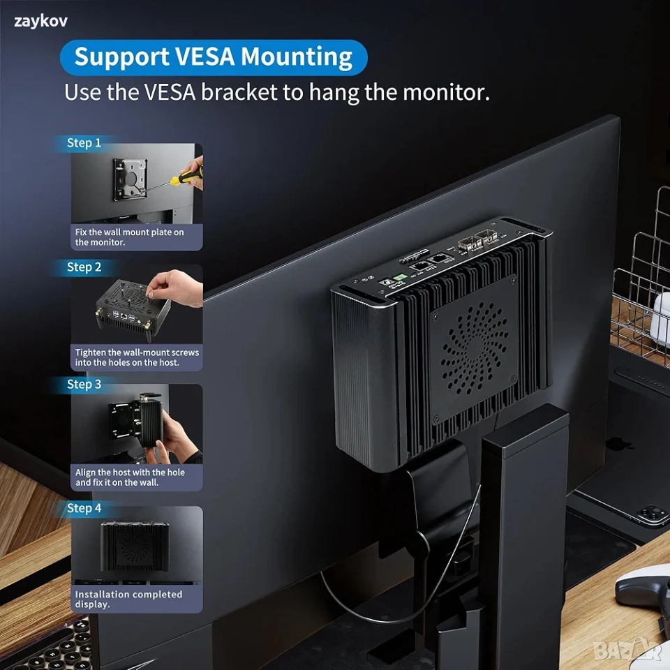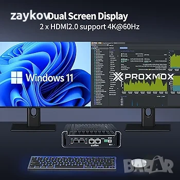 Поддръжка за активно и пасивно охлаждане: Мини компютърът използва вентилатори, за да поддържа системата хладна при нормално натоварване. За ниско натоварване или тиха среда, той използва усъвършенстван дизайн за пасивно охлаждане, за да охлажда системата безшумно - идеален за употреба у дома или в офиса.