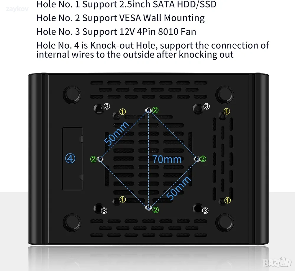Различни външни I/O портове: Мини компютърът е оборудван с 2 x HD2.0 порта и поддържа едновременно гледане на два екрана до 4K@60Hz. Процесорът има вградена UHD графика (1 GHz, 24 EUs). Други портове включват 1 x USB3.2 Type-A, 1 x USB3.2 Type-C, 4 x USB2.0 Type-A и 1 x слот за Micro SD карта.