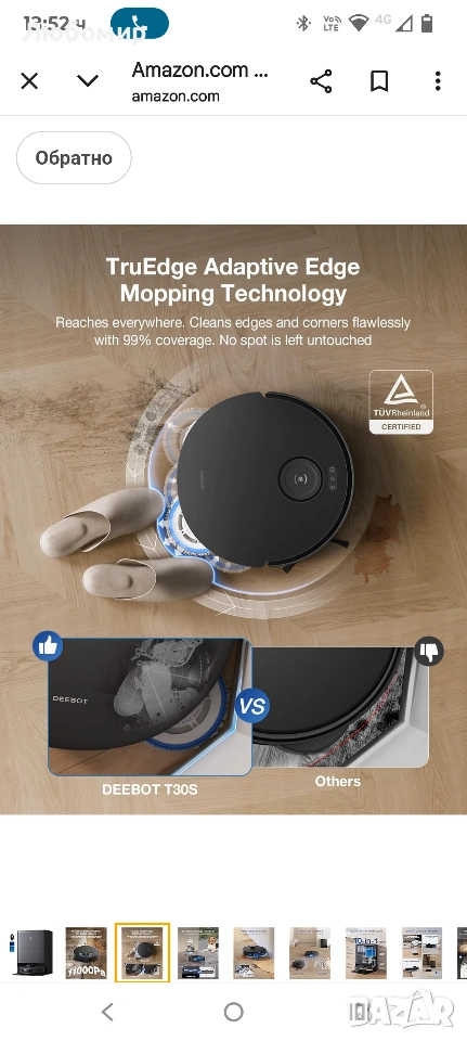 TruEdge Адаптивно почистване на ръбове - Оборудван с TruEdge технология, DEEBOT T30S PRO се отличава с почистване на ръбове и ъгли с несравнима прецизност. Чрез използването на летящо рамо и усъвършенствани алгоритми, той постига точност от 1 мм и значително подобрява 99% покритие в труднодостъпни места. Никое място не остава незасегнато.