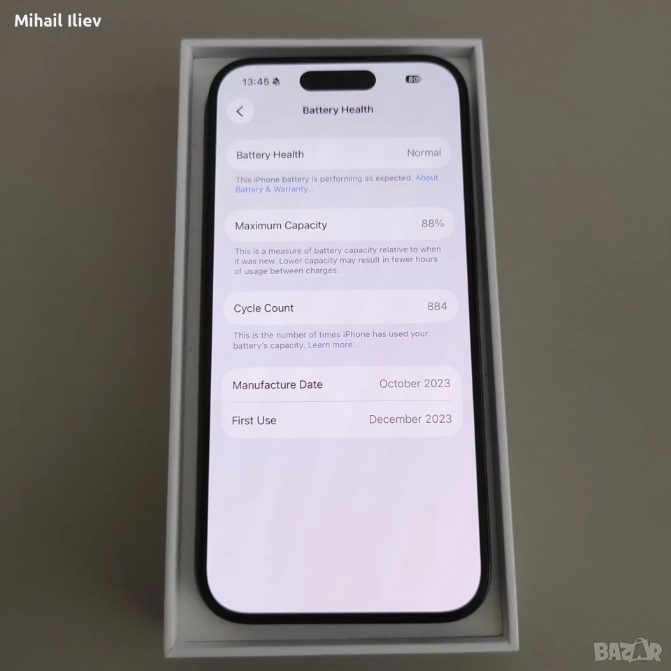 iPhone 15 pro 128GB, капацитет на батерията 88%