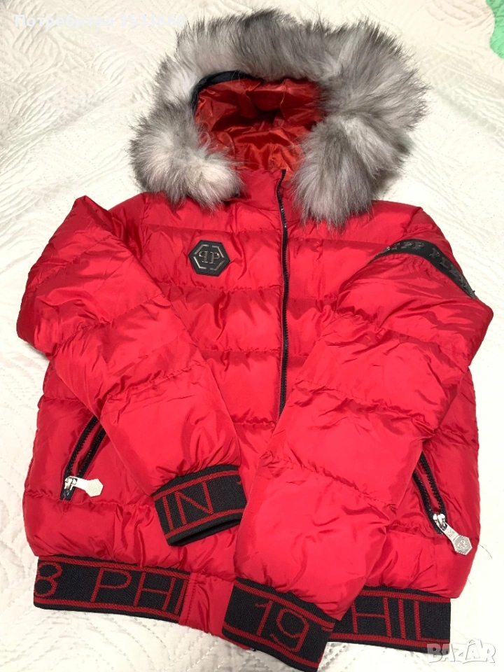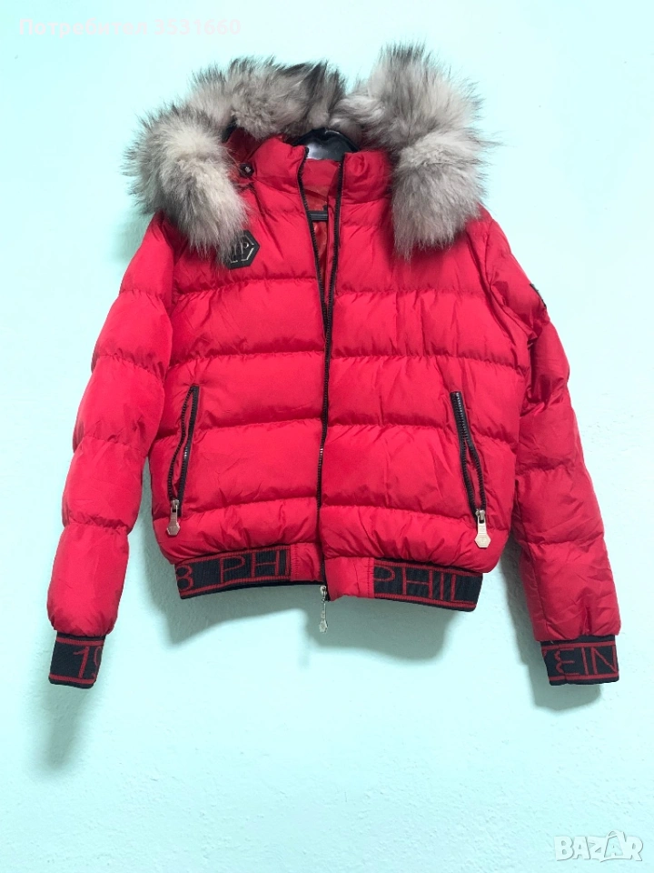 Дамско зимно червено късо яке с пълнеж от силиконова вата, марка “PHILIPP PLEIN”, размер L ( дължина-58см.,ширина-52 см.). Сваляща се качулка обточена с естествен косъм от лисица. Не пропуска вода и вятър. Ципове на джобовете.