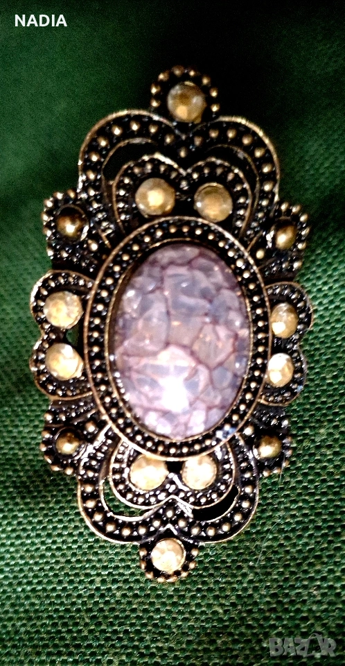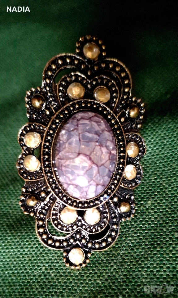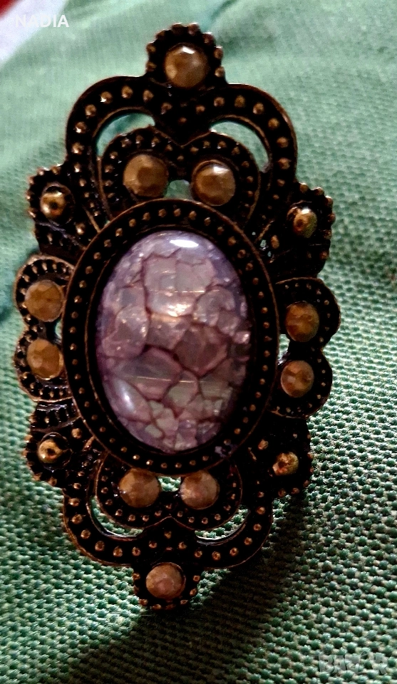 Пръстен винтидж стил. С оксидирана основа, бляскави камъчета и голям лилав камък в средата, регулира се големината. Короната е с размери 5/3 см.
