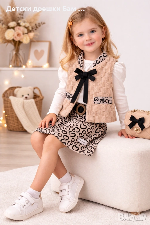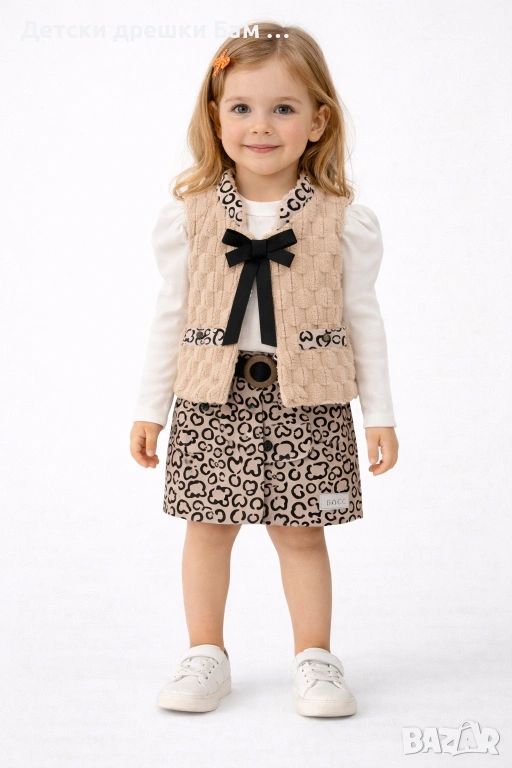 Стилен детски комплект за момиче, включващ блуза с дълъг ръкав, пола с колан и мек пухкав елек с панделка.