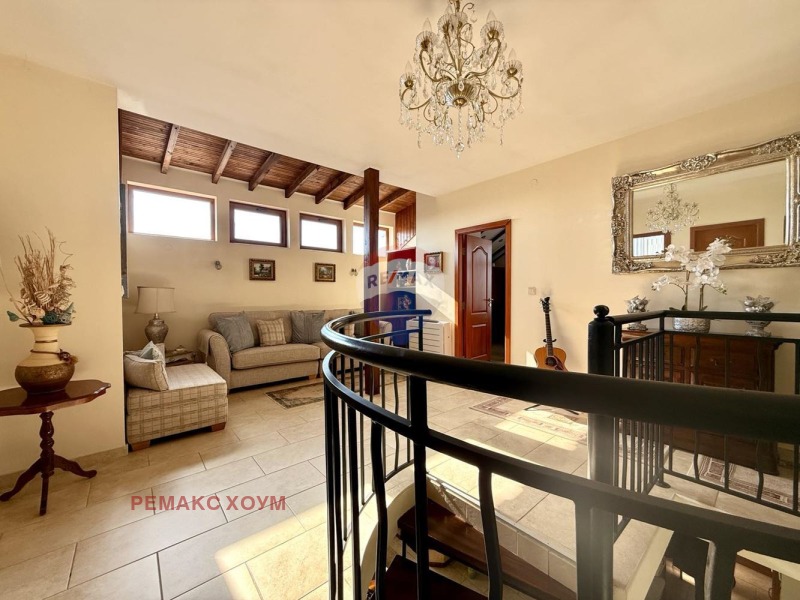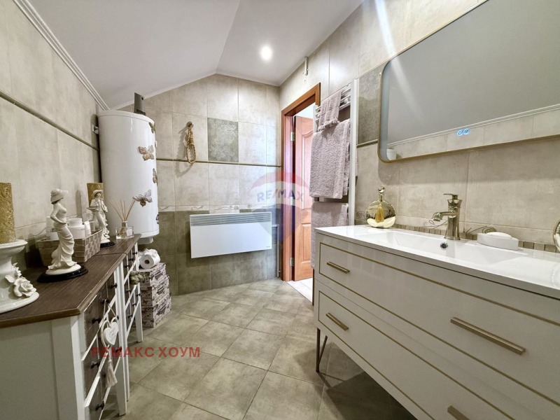 Жилищната сграда е с добра архитектурна визия и съвременен елегантен стил. Тухлена е, с достатъчно дебели стени и външна топлоизолация като е използвана висококачествена австрийска ламперия от истинско дърво. Изложението на имота е югоизток - северозапад, което го прави слънчев и комфортен. Изграждането на имота е осъществено по европейски стандарти с използване на висококачествени материали. Монтирана е качествена PVC дограма. Прозорците са много, което осигурява простор и максимален достъп на истинската светлина във всички стаи. Подовите настилки са качествени плочки от испански теракот. Покривът е в отлично състояние. Имотът е с функционално разпределение и проектиране. Всички стаи са уютни, стилно обзаведени и без преход. Всекидневната е много просторна и е удобно зонирана. Отоплението е комбинирано, което осигурява комфорт. Има електрическа камина, която може да стане истинска на дърва. Освен това са монтирани и нови мощни климатици, единият във всекидневната и още два подови климатика на марката Daikin на втория етаж. Във всяка стая има и монтрирани стенни конвекторни радиатори. Жилището се продава във вида, в който е представено на снимките /освен няколко елемента от мебелите/, напълно обзаведено и оборудвано с всичко необходимо за комфортно пребиваване и постоянно живеене. Приятните и топли цветове, и стилът на жилището са естетично съчетани с цялата идейна концепция. Интериорът създава усещане за топлина, елегантност и уют. Мебелите са от масивно истинско дърво, което подчертава дизайна и английския стил.