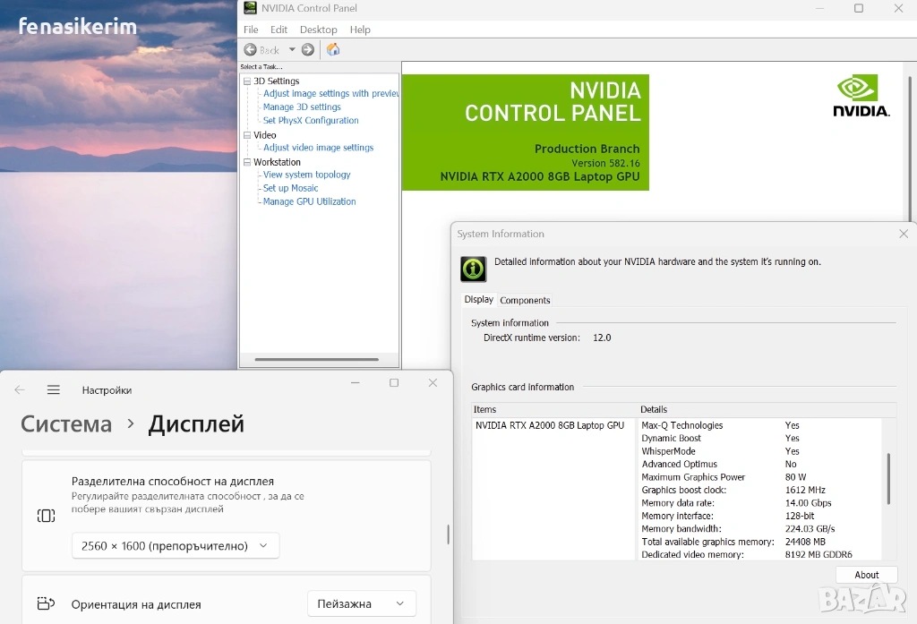 2 видеокарти : Nvidia RTX А2000 128bit 8GB DDR6 собствена памет + Intel UHD Video - up to 24 GB Total Graphics memory.