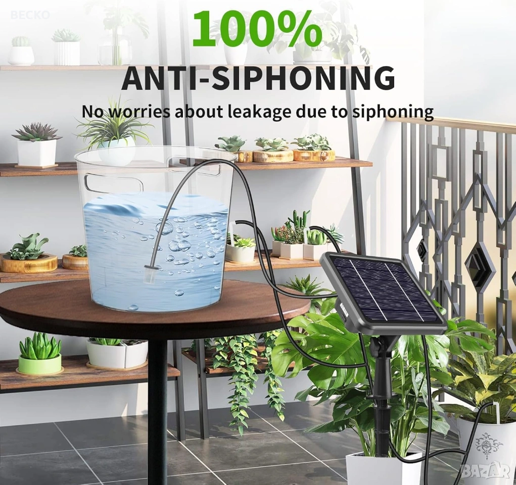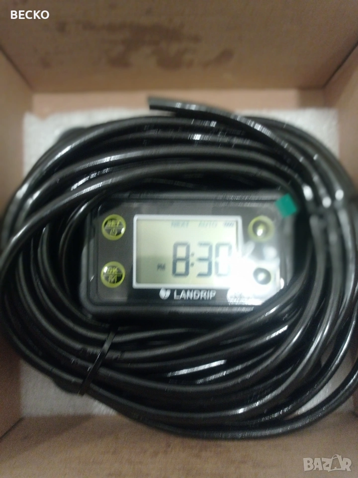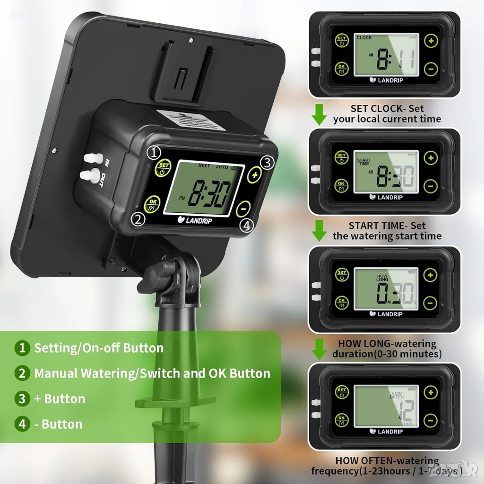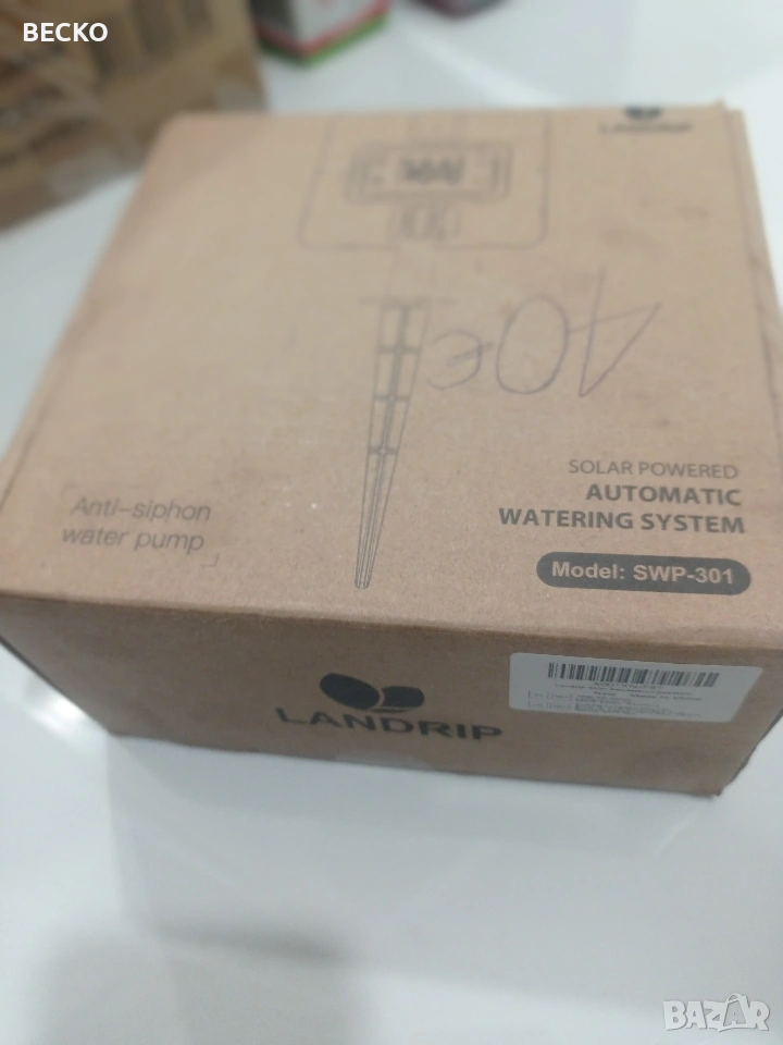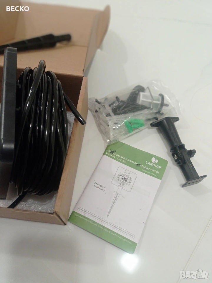 Landrip SWP-301, соларна автоматична система за капково напояване, предназначена за градини, тераси или оранжерии. Системата използва слънчева енергия за захранване на вградена помпа, която автоматично полива до 15 растения от контейнер с вода. Зарежда се от вграден соларен панел, който съхранява енергия за работа по всяко време. Спестяване на вода: Използва до 70% по-малко вода в сравнение с традиционните методи чрез прецизно напояване в корените. Персонализиране: Позволява настройка на продължителността и честотата на поливане чрез LCD екран. Анти-сифонна помпа: Новата технология предотвратява нежеланото изтичане на вода, когато източникът е по-високо от растенията. Настройка и програмиране Програмирането се извършва чрез бутоните на гърба на соларния панел: Инсталация: Соларният панел може да се монтира на стена или да се забие в земята на място с директна слънчева светлина. Свързване: Маркучите се изрязват и свързват към помпата, Т-образните съединители и капкообразувателите според разположението на саксиите. HOW LONG (Колко дълго): Настройва се продължителността на всяко поливане (от 0 до 30 минути). HOW OFTEN (Колко често): Настройва се честотата на цикъла (от 1 до 12 часа или от 1 до 7 дни). Поддръжка и съвети Важно: Уверете се, че височината на маркучите за всяко растение е сходна за равномерно разпределение на водата. Защита: Панелът е с водоустойчивост IP65, но трябва да се монтира правилно, за да се избегнат повреди. Аларми: Системата може да издава звуков сигнал, ако филтърът е запушен или водата в резервоара свърши. Чисто нова в оригиналната си кутия с маркучи и аксесоари.