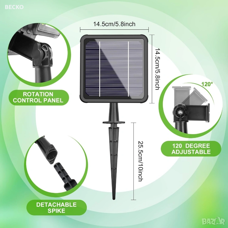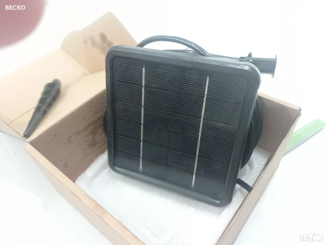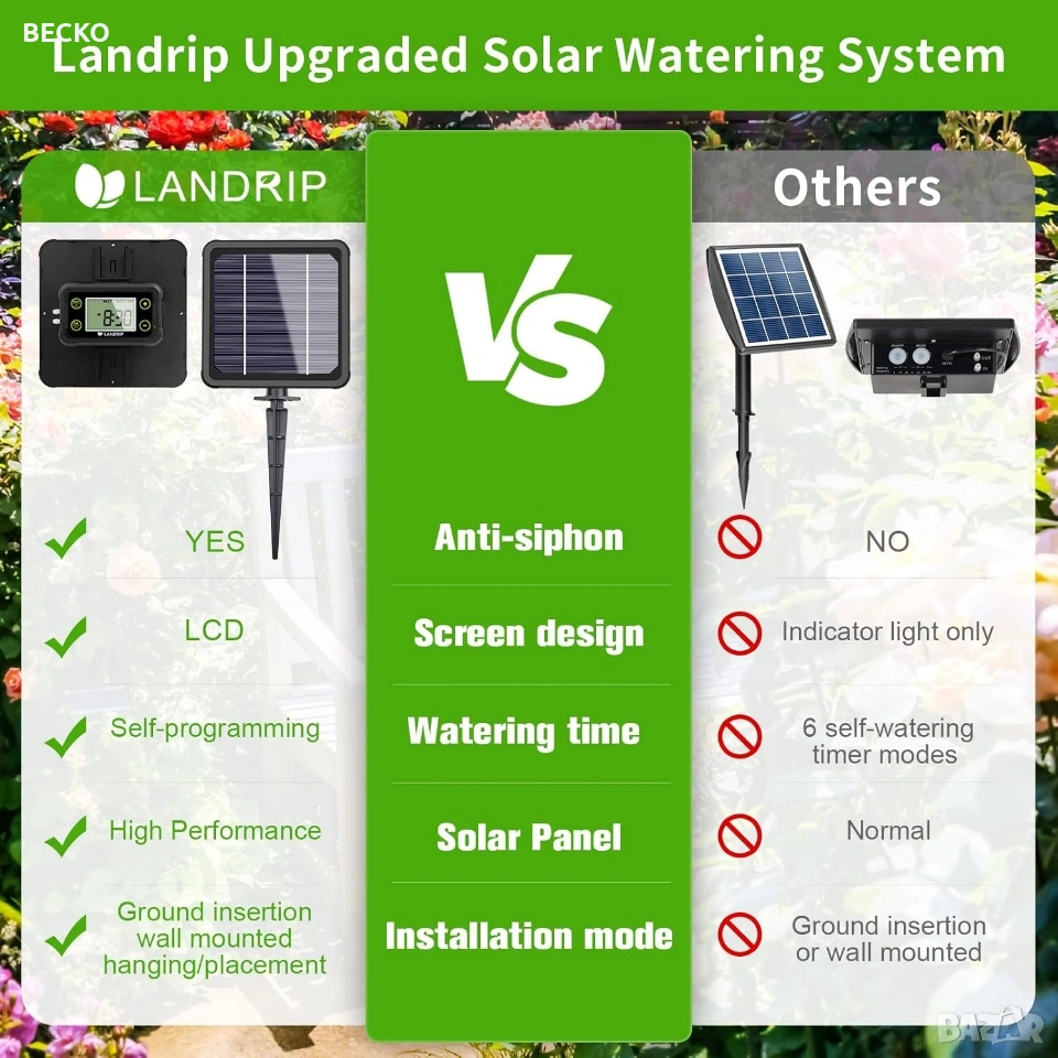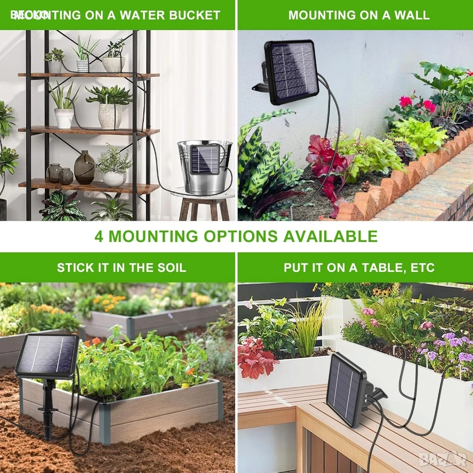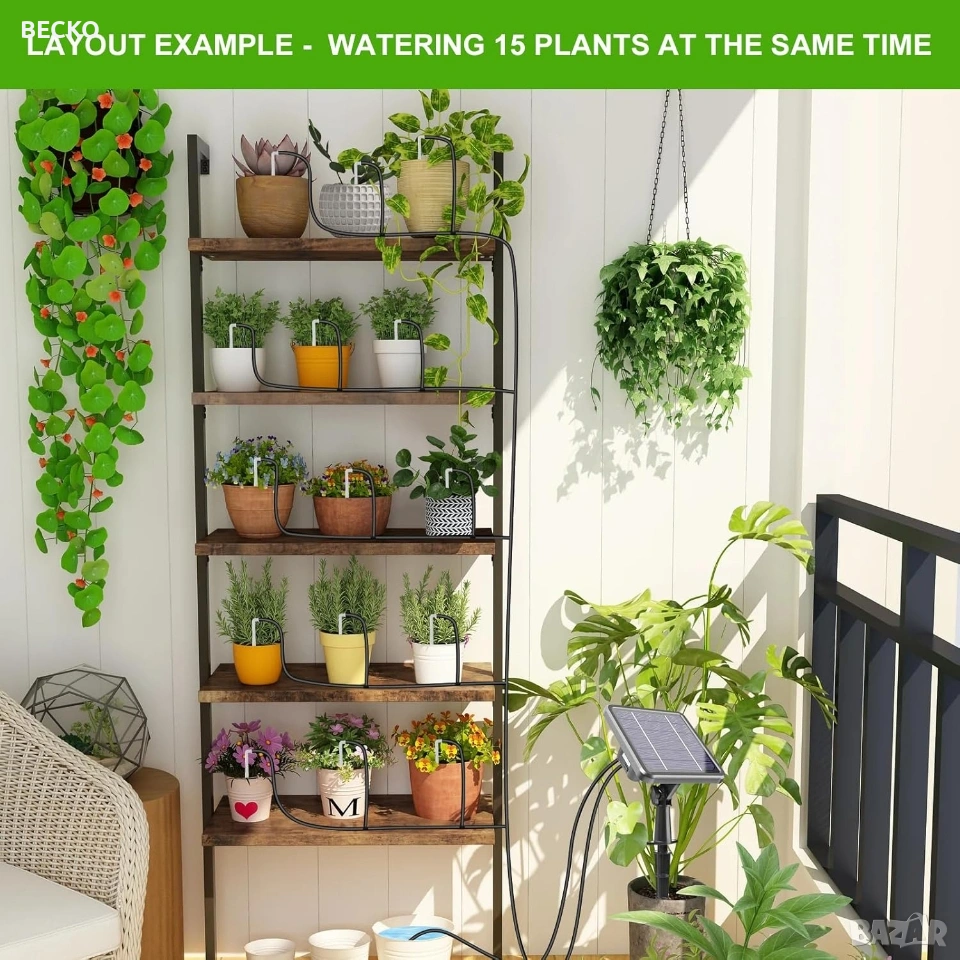 Landrip SWP-301, соларна автоматична система за капково напояване, предназначена за градини, тераси или оранжерии. Системата използва слънчева енергия за захранване на вградена помпа, която автоматично полива до 15 растения от контейнер с вода. Зарежда се от вграден соларен панел, който съхранява енергия за работа по всяко време. Спестяване на вода: Използва до 70% по-малко вода в сравнение с традиционните методи чрез прецизно напояване в корените. Персонализиране: Позволява настройка на продължителността и честотата на поливане чрез LCD екран. Анти-сифонна помпа: Новата технология предотвратява нежеланото изтичане на вода, когато източникът е по-високо от растенията. Настройка и програмиране Програмирането се извършва чрез бутоните на гърба на соларния панел: Инсталация: Соларният панел може да се монтира на стена или да се забие в земята на място с директна слънчева светлина. Свързване: Маркучите се изрязват и свързват към помпата, Т-образните съединители и капкообразувателите според разположението на саксиите. HOW LONG (Колко дълго): Настройва се продължителността на всяко поливане (от 0 до 30 минути). HOW OFTEN (Колко често): Настройва се честотата на цикъла (от 1 до 12 часа или от 1 до 7 дни). Поддръжка и съвети Важно: Уверете се, че височината на маркучите за всяко растение е сходна за равномерно разпределение на водата. Защита: Панелът е с водоустойчивост IP65, но трябва да се монтира правилно, за да се избегнат повреди. Аларми: Системата може да издава звуков сигнал, ако филтърът е запушен или водата в резервоара свърши. Чисто нова в оригиналната си кутия с маркучи и аксесоари.