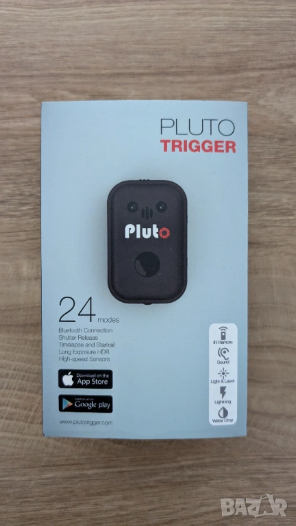 Pluto Trigger е високоскоростен интелигентен спусък за камера, който се управлява от безплатно приложение за iPhone/Android през Bluetooth LE (ниска енергия). Може да се използва за дистанционно снимане, таймлапс, фотография с висок динамичен диапазон (HDR), видеозапис и фотография на светкавици. Той позволява на вашия DSLR фотоапарат да прави високоскоростна фотография, задействана от звук, светлина или от нещо, пречупващо лазерен лъч, насочен към Pluto Trigger (лазерът е включен). С вградения PIR сензор, Pluto Trigger може да открива телесната топлина на животните и да прави снимки. Той може също така да изчака, докато човек се усмихне, за да направи снимка, или да прави снимки, задействани от движение или вибрация. Познавате ли онези фантастични снимки на водни капчици, сблъскващи се във въздуха? Има режим и за това (необходим е капков клапан) - общо 24 режима.