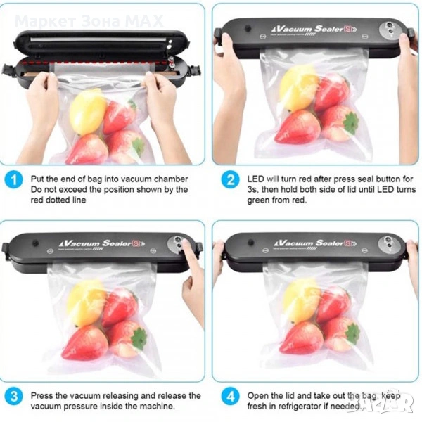 Уредът ефективно изтегля въздуха и запечатва плътно опаковките, като предпазва продуктите от влага, бактерии и образуване на скреж във фризера.