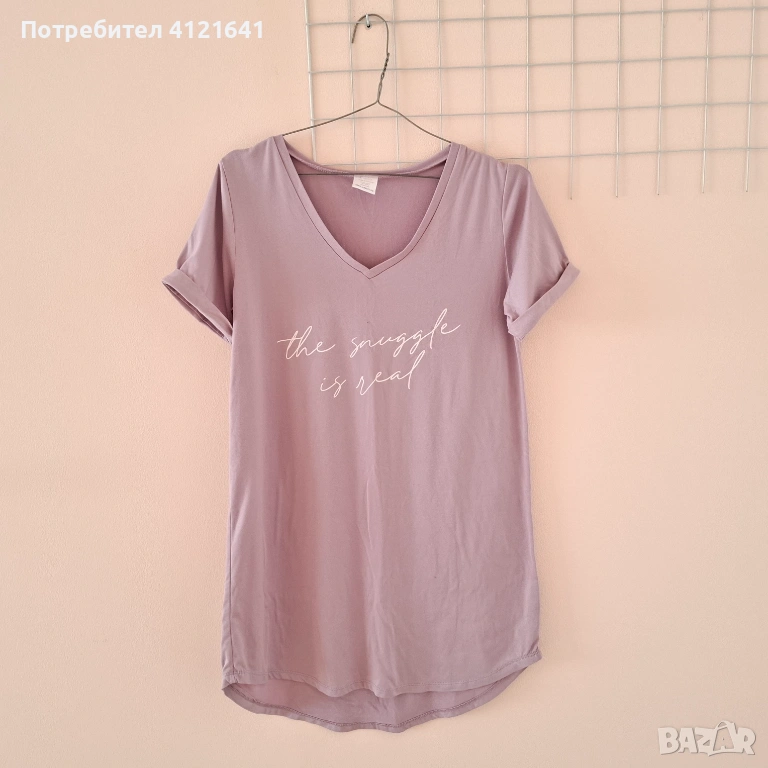 Кокетна нощничка, НОВА, размер S-M. Купена в САЩ, производство Китай. Гръдна обиколка 96 см, ханш 100, дължина: 80 см отпред, 90 см отзад. Материал полиестер 95 %, Спандех 5 %. С торбичка за прибиране. Цвят лилав, с надпис отпред: The snuggle is real = Прегръдката е истинска.