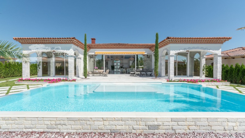 От верандата се излиза към просторен басейн, централно разположен в градината и облицован с естествен мрамор Pyrgos Light. Дворът е богато озеленен с екзотични дървета и цветя и разполага с оформени зони за отдих и шезлонги.