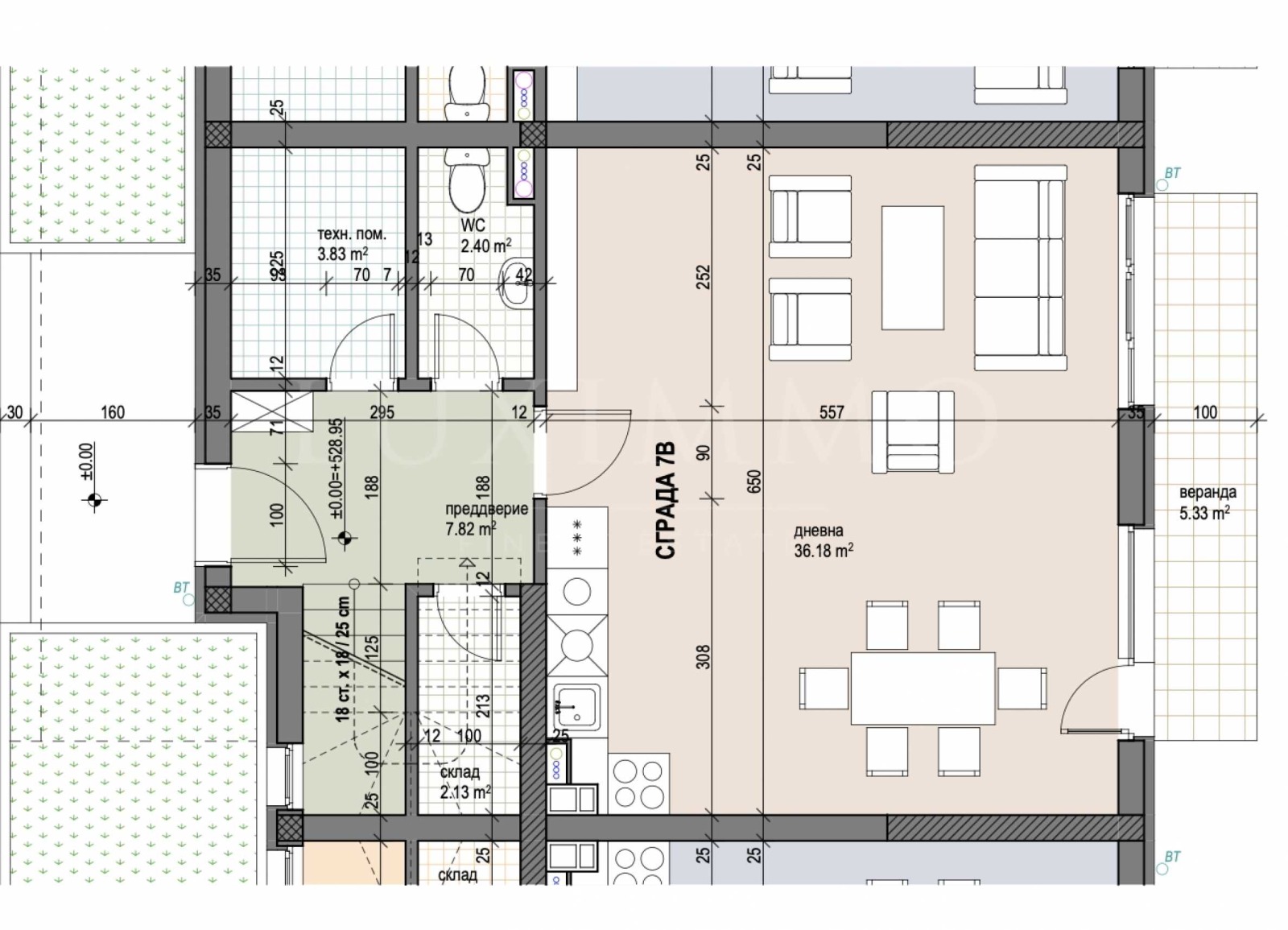 коридор, предверие, слад, тоалетна, дневна с кухненски бокс, стълбище