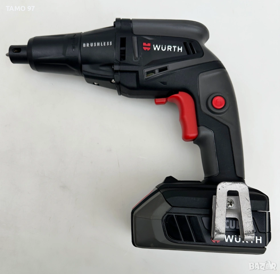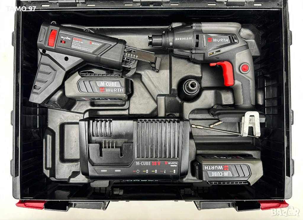 Продавам професионален безчетков винтоверт за сухо строителство (гипсокартон) на Вюрт с автоматичен режим. Машината е неразличима от нова, както се вижда на снимките използвана е броени пъти и работи брилянтно, внос от Франция. Обявената цена включва винтоверт с дълбокомер, магазин за ленти, две батерии M-cube по 18V 2.0Ah с индикатор, бързо зарядно и оригинален куфар. При желание на клиента може и да е с две 5.0Ah батерии вместо 2.0Ah и цената тогава ще е 340лв. Пращаме с опция преглед и тест с куриерска фирма еконт може и лично предаване за гр. Шумен.