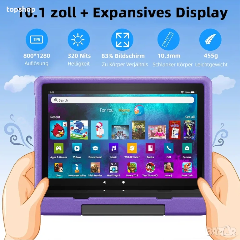 Грижа за зрението 10 инчовият екран разполага с технология за защита на очите която намалява синята светлина и умората при четене или игра.