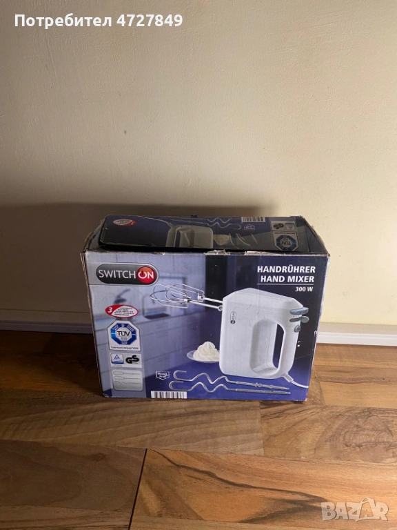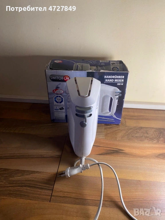 Продавам ръчен миксер Switch On. Уредът е нов, в оригиналната си опаковка, но се продава без бъркалките (без куки за месене и метлички за разбиване).