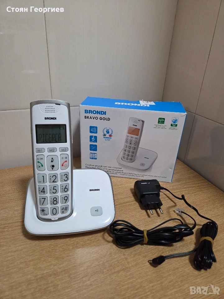 Безжичен телефон Brondi Bravo Gold. Неговите характеристики включват: DECT технология Функция "свободни ръце" (спийкърфон) Голям, лесен за четене, осветен буквено-цифров дисплей Големи бутони на клавиатурата за лесно набиране Функция "BOOST" за усилен звук с контрол на тона
