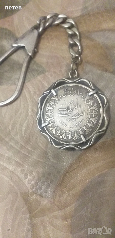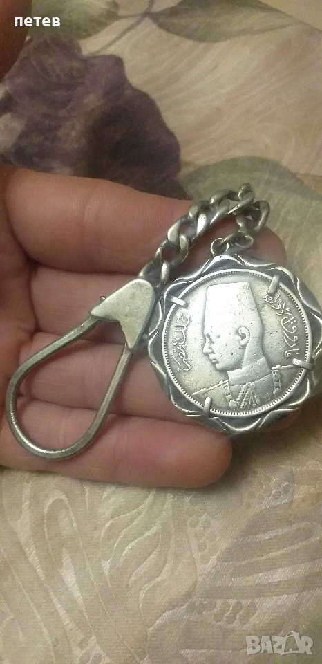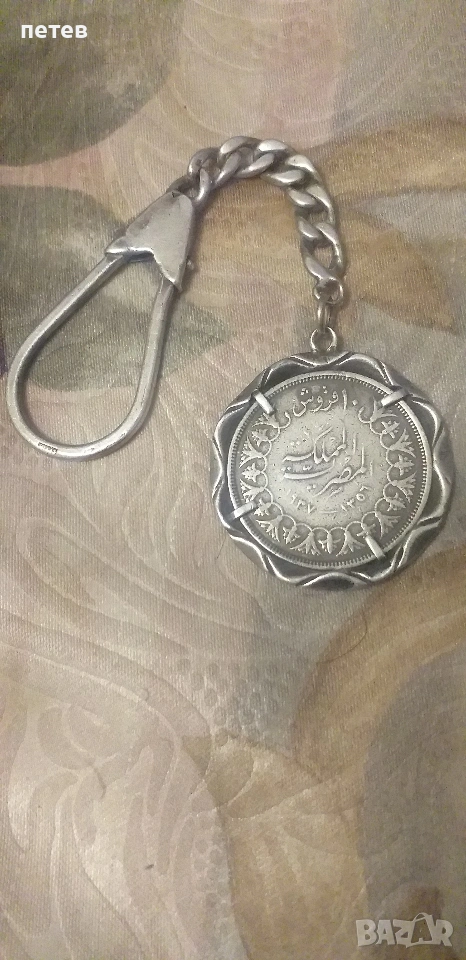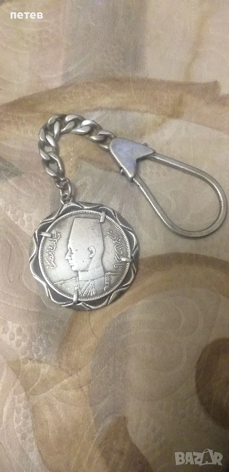 стар сребърен ключодържател със сребърна монета на крал Фарук. монетата може да се откача извън касата на ключодържателя. състоянието е видно по снимките.