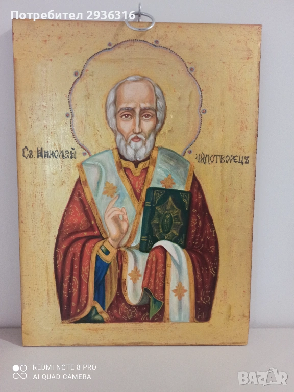 Предлагам ви тази прекрасна, голяма икона на Свети Николай Чудотворец. Рисувана е на ръка върху дървена дъска и стои много тежко и авторитетно на стена.
