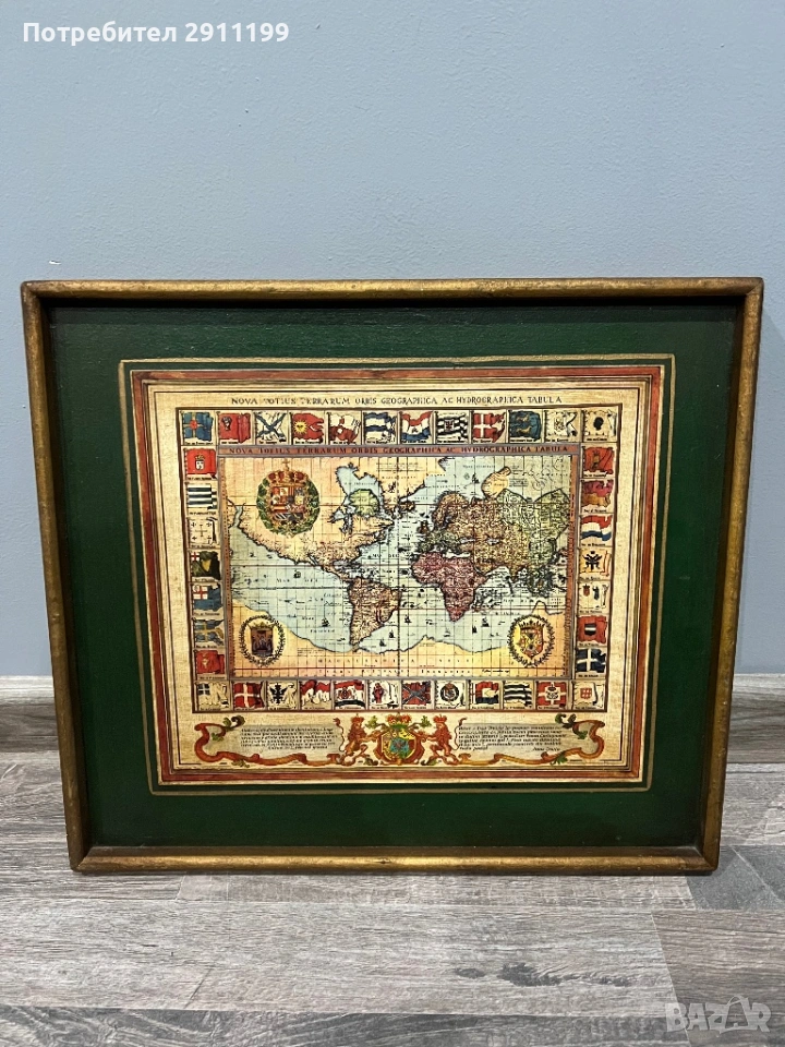 е с карта на света (със зелено паспарту),