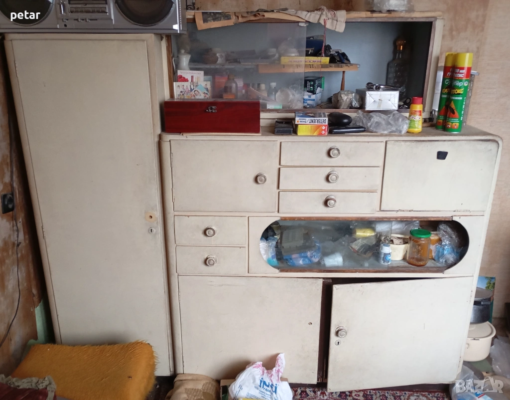 Бял старинен бюфет от соца. В много добро състояние, запазен, без счупвания и липсващи елементи. Вземане от място. Намира се в гр. Игнатиево (Варненско).