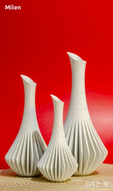 Стилен комплект от три 3D принтирани декоративни вази с елегантна оребрена форма и минималистичен дизайн. Изработени от висококачествен материал с фина текстура, вазите са леки, устойчиви и подходящи за сухи цветя, декоративни треви или като самостоятелен интериорен акцент.